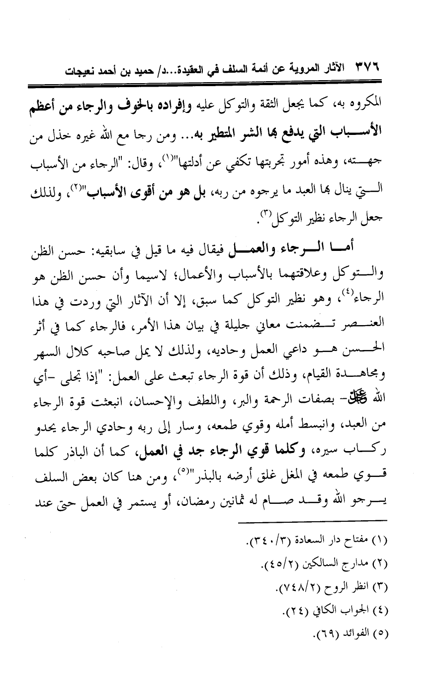 أما الرجاء والعمل فيقال فيه ما قيل في سابقيه: حسن الظن والتوكل وعلاقتهما بالأسباب والأعمال؛ لاسيما وأن حسن الظن هو الرجاء (¬٤)، وهو نظير التوكل كما سبق، إلا أن الآثار التي وردت في هذا العنصر تضمنت معاني جليلة في بيان هذا الأمر، فالرجاء كما في أثر الحسن هو داعي العمل وحاديه، ولذلك لا يمل صاحبه كلال السهر ومجاهده القيام، وذلك أن قوة الرجاء تبعث على العمل: "إذا تجلى -أي اللَّه -عَزَّ وَجَلَّ- بصفات الرحمة والبر، واللطف والإحسان، انبعثت قوة الرجاء من العبد، وانبسط أمله وقوي طمعه، وسار إلى ربه وحادي الرجاء يحدو ركاب سيره، وكلما قوي الرجاء جد في العمل، كما أن الباذر كلما قوي طمعه في المغل غلق أرضه بالبذر" (¬٥)، ومن هنا كان بعض السلف يرجو اللَّه وقد صام له ثمانين رمضان، أو يستمر في العمل حتى عند