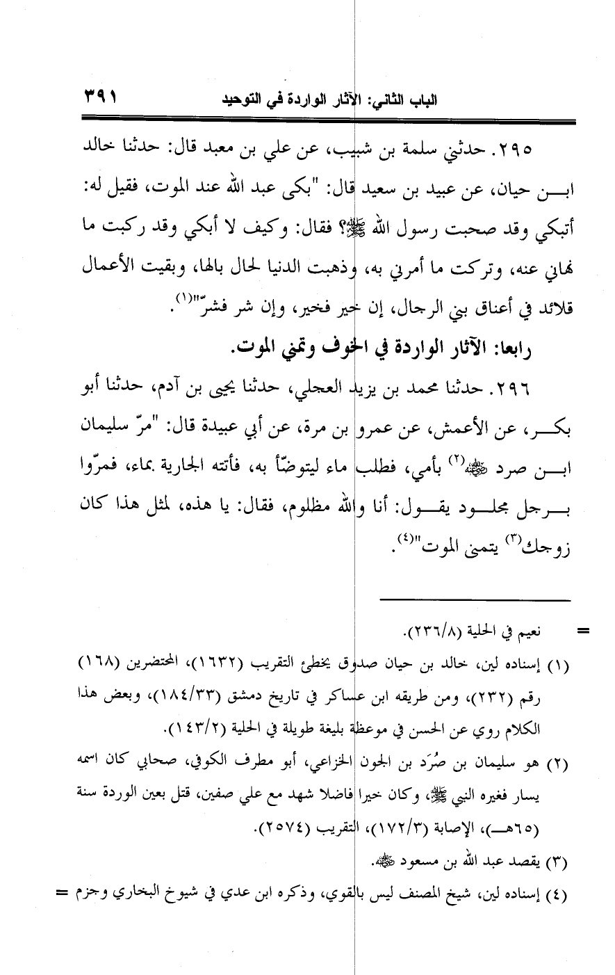 ٢٩٥ - حدثني سلمة بن شبيب، عن علي بن معبد قال: حدثنا خالد ابن حيان، عن عبيد بن سعيد قال: "بكى عبد اللَّه عند الموت، فقيل له: أتبكي وقد صحبت رسول اللَّه -صلى اللَّه عليه وسلم-؟ فقال: وكيف لا أبكي وقد ركبت ما نهاني عنه، وتركت ما أمرني به، وذهبت الدنيا لحال بالها، وبقيت الأعمال قلائد في أعناق بني الرجال، إن خير فخير، وإن شر فشرّ" (¬١).