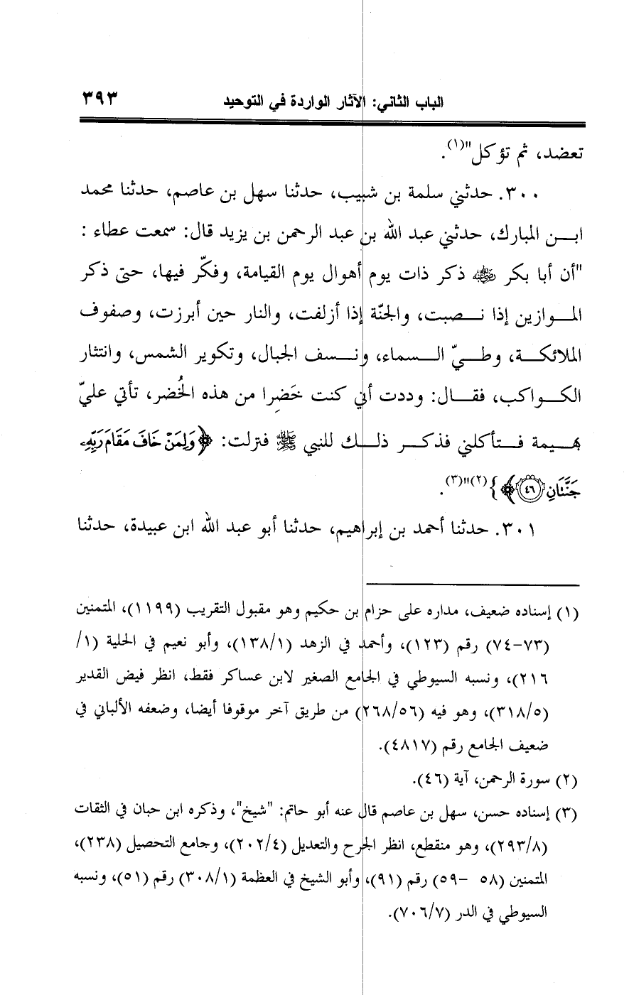 ٣٠٠ - حدثني سلمة بن شبيب، حدثنا سهل بن عاصم، حدثنا محمد ابن المبارك، حدثني عبد اللَّه عبد الرحمن بن يزيد قال: سمعت عطاء: "أن أبا بكر -رضي اللَّه عنه- ذكر ذات يوم أهوال يوم القيامة، وفكّر فيها، حتى ذكر الموازين إذا نصبت، والجنّة إذا أزلفت، والنار حين أبرزت، وصفوف الملائكة، وطيّ السماء، ونسف الجبال، وتكوير الشمس، وانتثار الكواكب، فقال: وددت أني كنت خَضِرا من هذه الخُضر، تأتي عليّ بهيمة فتأكلني فذكر ذلك للنبي -صلى اللَّه عليه وسلم- فنزلت: {وَلِمَنْ خَافَ مَقَامَ رَبِّهِ جَنَّتَانِ (٤٦)} (¬٢) " (¬٣).