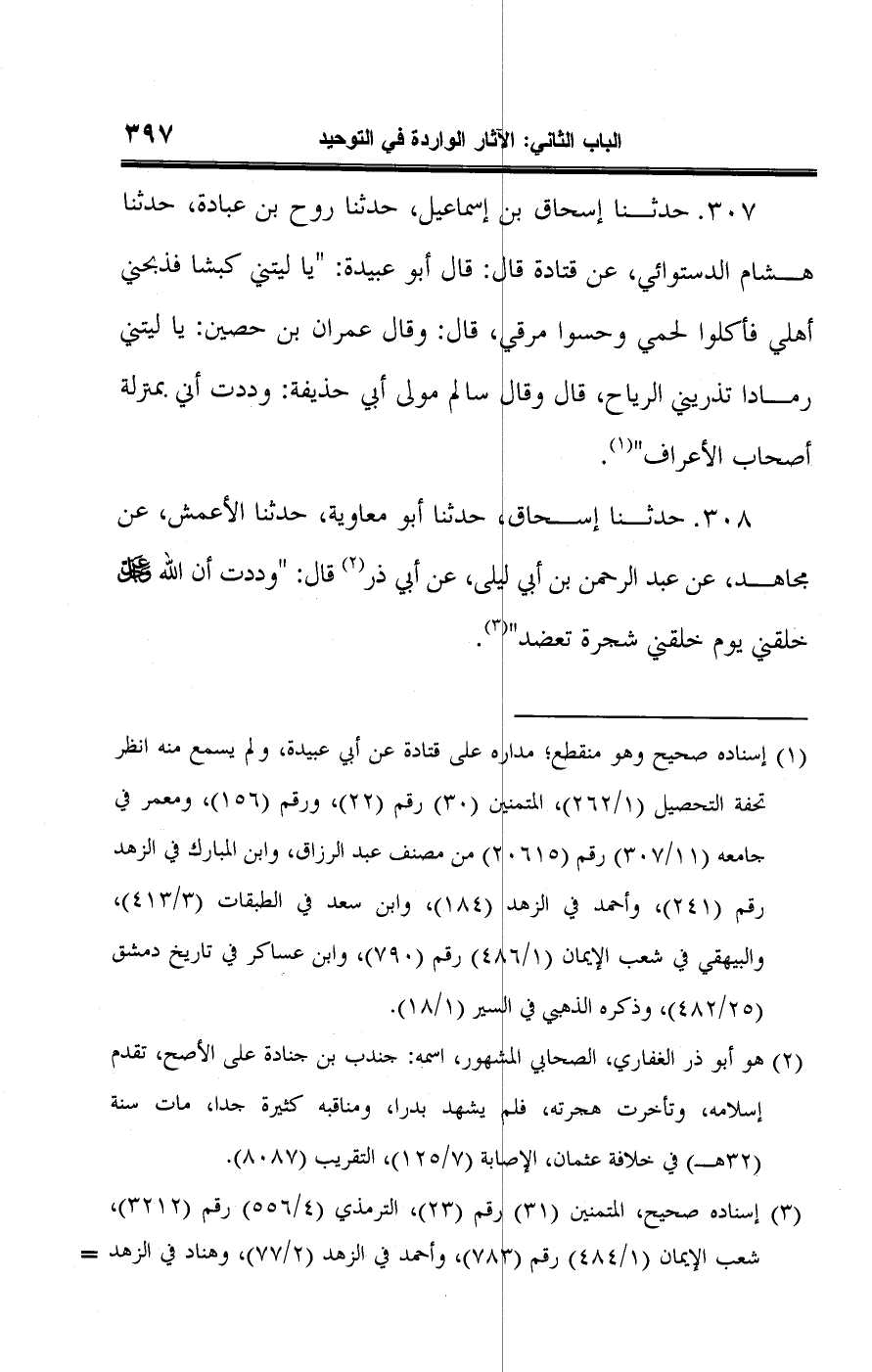 ٣٠٧ - حدثنا إسحاق بن إسماعيل، حدثنا روح بن عبادة، حدثنا هشام الدستوائي، عن قتادة قال: قال أبو عبيدة: "يا ليتني كبشا فذبحني أهلي فأكلوا لحمى وحسوا مرقي، قال: وقال عمران بن حصين: يا ليتني رمادا تذريني الرياح، قال وقال سالم مولى أبي حذيفة: وددت أني بمنزلة أصحاب الأعراف" (¬١).
