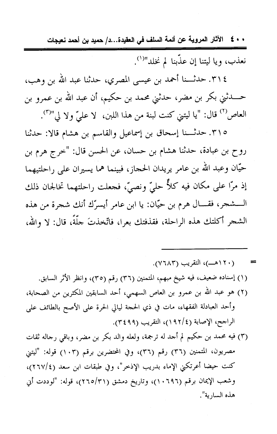 ٣١٤ - حدثنا أحمد بن عيسى المصري، حدثنا عبد اللَّه بن وهب، حدثني بكر بن مضر، حدثني محمد بن حكيم، أن عبد اللَّه بن عمرو بن العاص (¬٢) قال: "يا ليتني كنت لبنة من هذا اللبن، لا عليّ ولا لي" (¬٣).