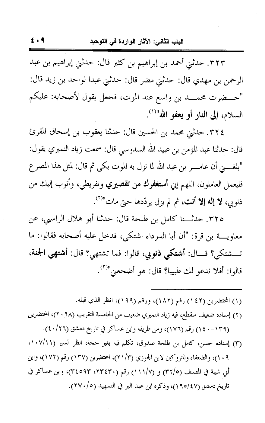 ٣٢٣ - حدثني أحمد بن إبراهيم بن كثير قال: حدثني إبراهيم بن عبد الرحمن بن مهدي قال: حدثني مضر قال: حدثني عبد الواحد بن زيد قال: "حضرت محمد بن واسع عند الموت، فجعل يقول لأصحابه: عليكم السلام، إلى النار أو يعفو اللَّه" (¬١).