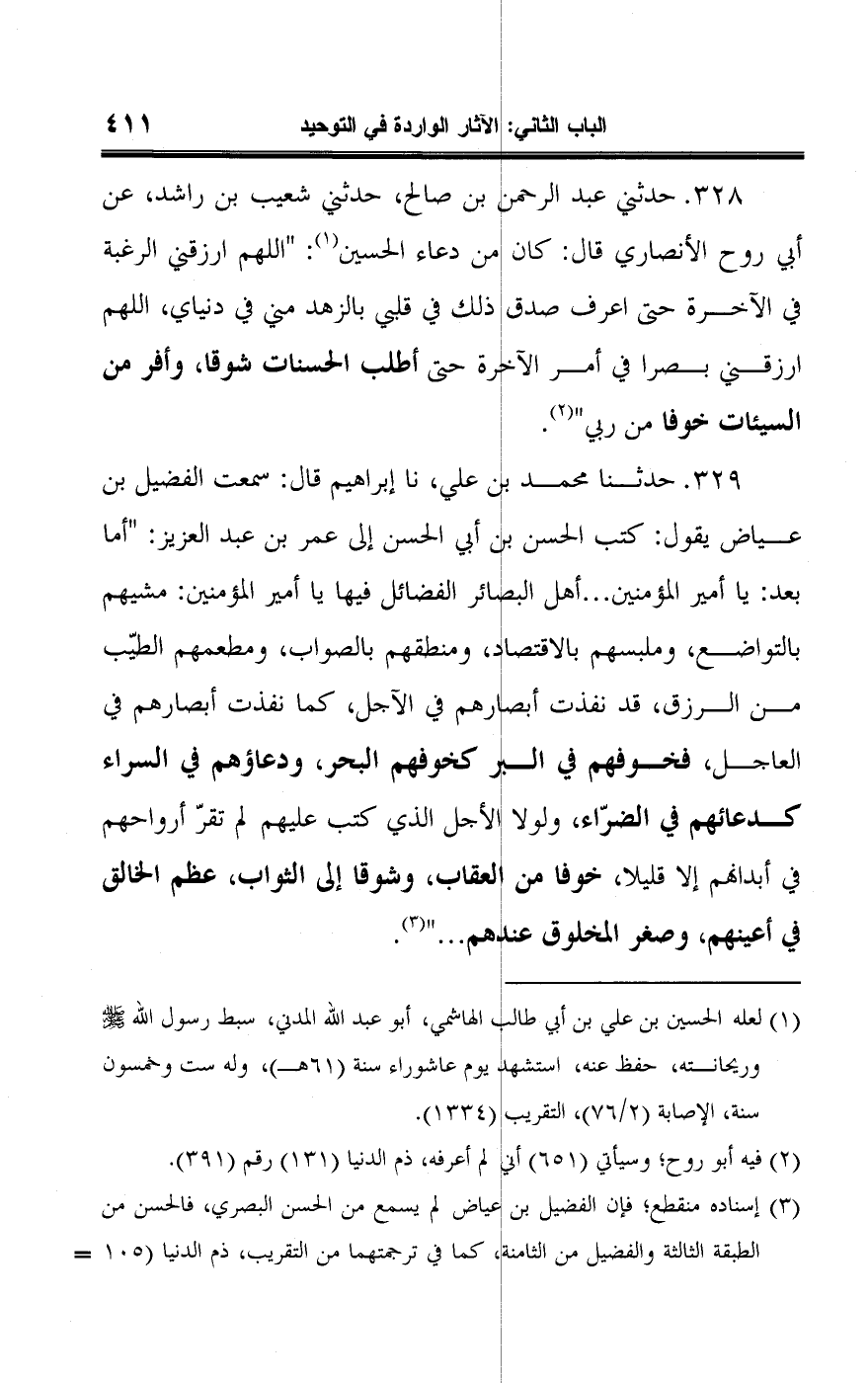 ٣٢٨ - حدثني عبد الرحمن بن صالح، حدثني شعيب بن راشد، عن أبي روح الأنصاري قال: كان من دعاء الحسين (¬١): "اللهم ارزقني الرغبة في الآخرة حتى اعرف صدق ذلك في قلبي بالزهد مني في دنياي، اللهم ارزقني بصرا في أمر الآخرة حتى أطلب الحسنات شوقا، وأفر من السيئات خوفا من ربي" (¬٢).