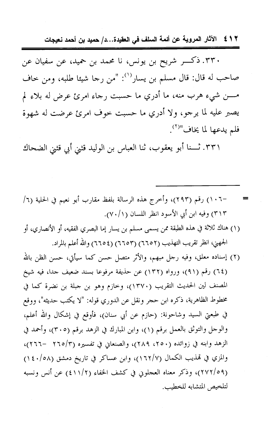 ٣٣٠ - ذكر شريح بن يونس، نا محمد بن حميد، عن سفيان عن صاحب له قال: قال مسلم بن يسار (¬١): "من رجا شيئا طلبه، ومن خاف من شيء هرب منه، ما أدري ما حسبت رجاء امرئ عرض له بلاء لم يصبر عليه لما يرجو، ولا أدري ما حسبت خوف امرئ عرضت له شهوة فلم يدعها لما يخاف" (¬٢).