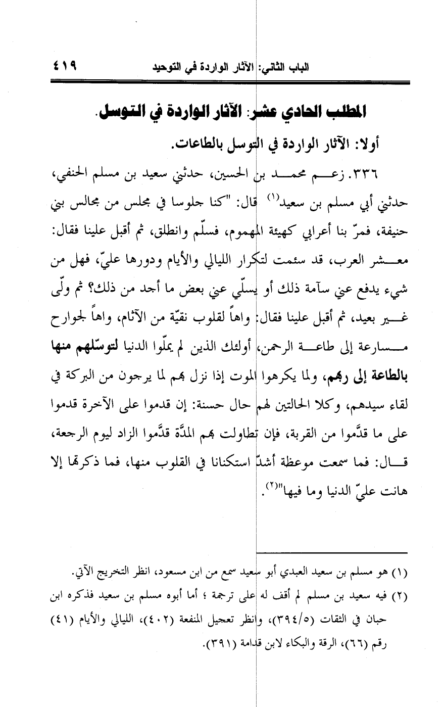 (¬٢) فيه سعيد بن مسلم لم أقف له على ترجمة؛ أما أبوه مسلم بن سعيد فذكره ابن حبان في الثقات (٥/ ٣٩٤)، وانظر تعجيل المنفعة (٤٠٢)، الليالي والأيام (٤١) رقم (٦٦)، الرقة والبكاء لابن قدامة (٣٩١).