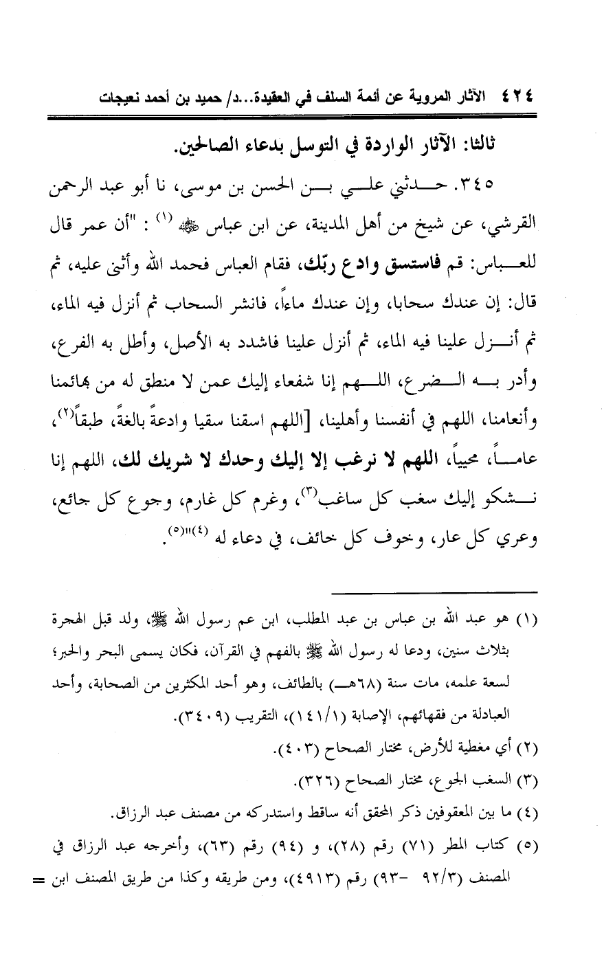 ٣٤٥ - حدثني علي بن الحسن بن موسى، نا أبو عبد الرحمن القرشي، عن شيخ من أهل المدينة، عن ابن عباس -رضي اللَّه عنه- (¬١): "أن عمر قال للعباس: قم فاستسق وادع ربّك، فقام العباس فحمد اللَّه وأثنى عليه، ثم قال: إن عندك سحابا، وإن عندك ماءًا، فانشر السحاب ثم أنزل فيه الماء، ثم أنزل علينا فيه الماء، ثم أنزل علينا فاشدد به الأصل، وأطل به الفرع، وأدر به الضرع، اللهم إنا شفعاء إليك عمن لا منطق له من بهائمنا وأنعامنا، اللهم في أنفسنا وأهلينا، [اللهم اسقنا سقيا وادعةً بالغةً، طبقًا (¬٢)، عامًا، محييًا، اللهم لا نرغب إلا إليك وحدك لا شريك لك، اللهم إنا نشكو إليك سغب كل ساغب (¬٣)، وغرم كل غارم، وجوع كل جائع، وعري كل عار، وخوف كل خائف، في دعاء له (¬٤) " (¬٥).