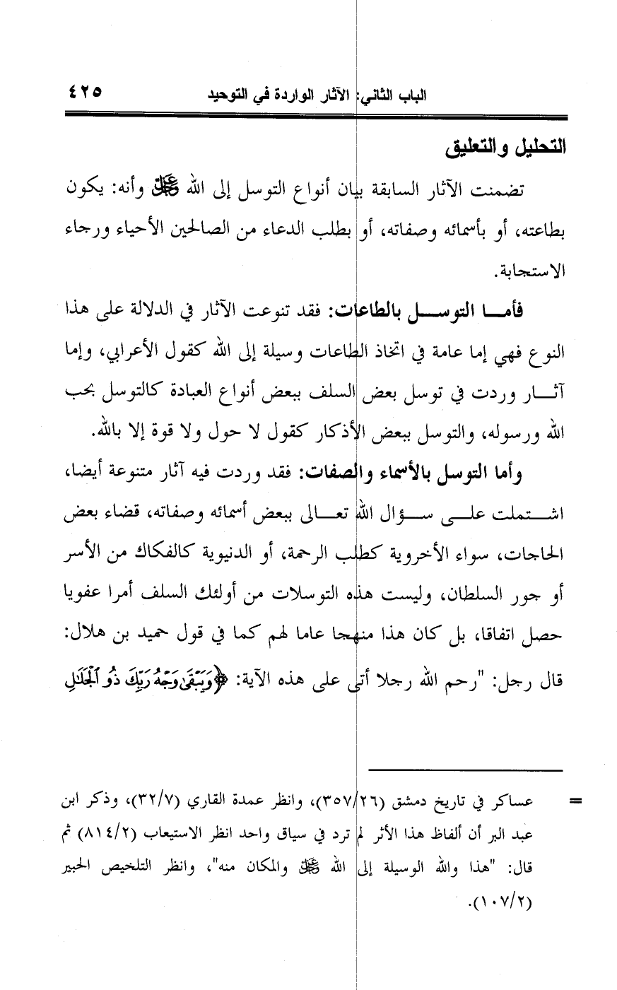 وأما التوسل بالأسماء والصفات: فقد وردت فيه آثار متنوعة أيضًا، اشتملت على سؤال اللَّه تعالى ببعض أسمائه وصفاته، قضاء بعض الحاجات، سواء الأخروية كطلب الرحمة، أو الدنيوية كالفكاك من الأسر أو جور السلطان، وليست هذه التوسلات من أولئك السلف أمرا عفويا حصل اتفاقا، بل كان هذا منهجا عاما لهم كما في قول حميد بن هلال: قال رجل: "رحم اللَّه رجلا أتى على هذه الآية: {وَيَبْقَى وَجْهُ رَبِّكَ ذُو الْجَلَالِ