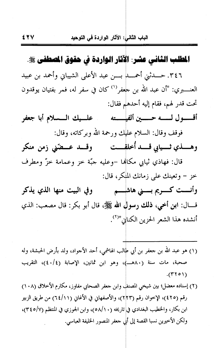 (¬٢) إسناده معضل؛ بين شيخي المصنف وابن جعفر الصحابي مفاوز، مكارم الأخلاق (١٠٨) رقم (٤٢٥)، الإخوان رقم (٢١٣)، والأصفهاني في الأغاني (١١/ ٦٤) من طريق الزبير ابن بكار، والخطيب البغدادي في تاريخه (١٠/ ٥٨)، وابن الجوزي في المنتظم (٧/ ٣٤٥)، ولكن الأخيرين في نسبا القصة إلى أبي جعفر المنصور الخليفة العباسي.