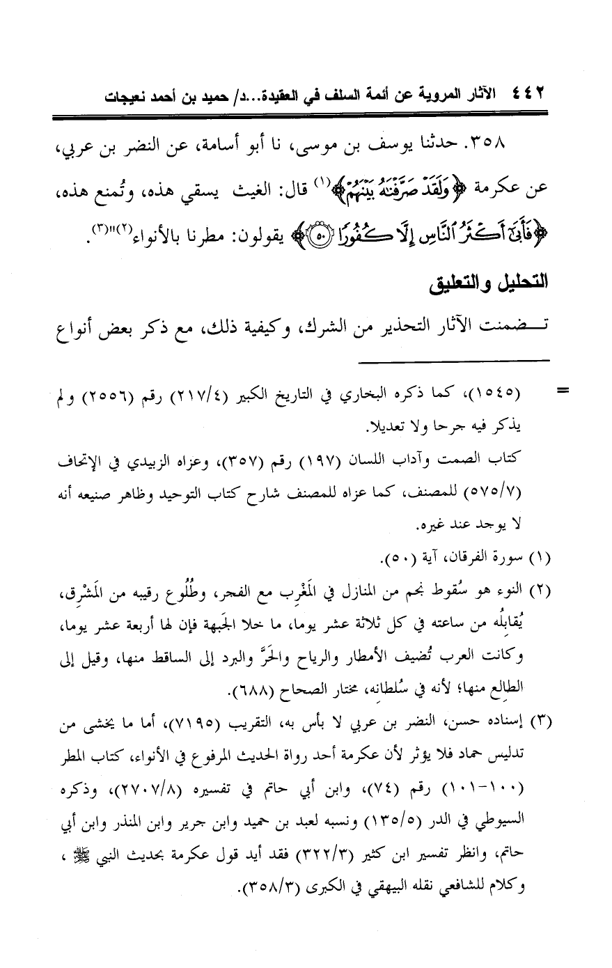 ٣٥٨ - حدثنا يوسف بن موسى، نا أبو أسامة، عن النضر بن عربي، عن عكرمة {وَلَقَدْ صَرَّفْنَاهُ بَيْنَهُمْ} (¬١) قال: الغيث يسقي هذه، وتُمنع هذه، {فَأَبَى أَكْثَرُ النَّاسِ إِلَّا كُفُورًا (٥٠)} يقولون: مطرنا بالأنواء (¬٢) " (¬٣).
