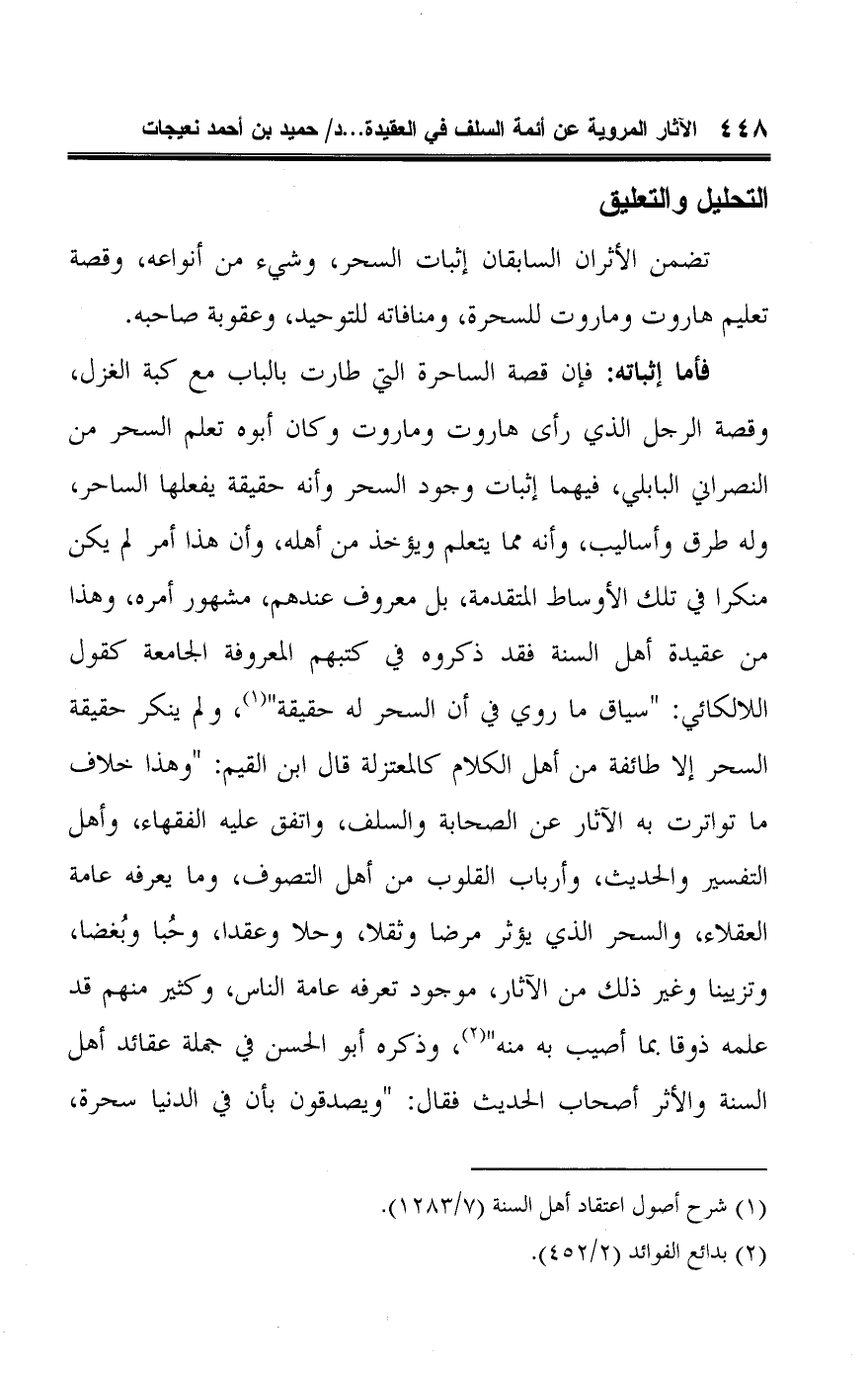 فأما إثباته: فإن قصة الساحرة التي طارت بالباب مع كبة الغزل، وقصة الرجل الذي رأى هاروت وماروت وكان أبوه تعلم السحر من النصراني البابلي، فيهما إثبات وجود السحر وأنه حقيقة يفعلها الساحر، وله طرق وأساليب، وأنه مما يتعلم ويؤخذ من أهله، وأن هذا أمر لم يكن منكرا في تلك الأوساط المتقدمة، بل معروف عندهم، مشهور أمره، وهذا من عقيدة أهل السنة فقد ذكروه في كتبهم المعروفة الجامعة كقول اللالكائي: "سياق ما روي في أن السحر له حقيقة" (¬١)، ولم ينكر حقيقة السحر إلا طائفة من أهل الكلام كالمعتزلة قال ابن القيم: "وهذا خلاف ما تواترت به الآثار عن الصحابة والسلف، واتفق عليه الفقهاء، وأهل التفسير والحديث، وأرباب القلوب من أهل التصوف، وما يعرفه عامة العقلاء، والسحر الذي يؤثر مرضا وثقلا، وحلا وعقدا، وحُبا وبُغضا، وتزيينا وغير ذلك من الآثار، موجود تعرفه عامة الناس، وكثير منهم قد علمه ذوقا بما أصيب به منه" (¬٢)، وذكره أبو الحسن في جملة عقائد أهل السنة والأثر أصحاب الحديث فقال: "ويصدقون بأن في الدنيا سحرة،