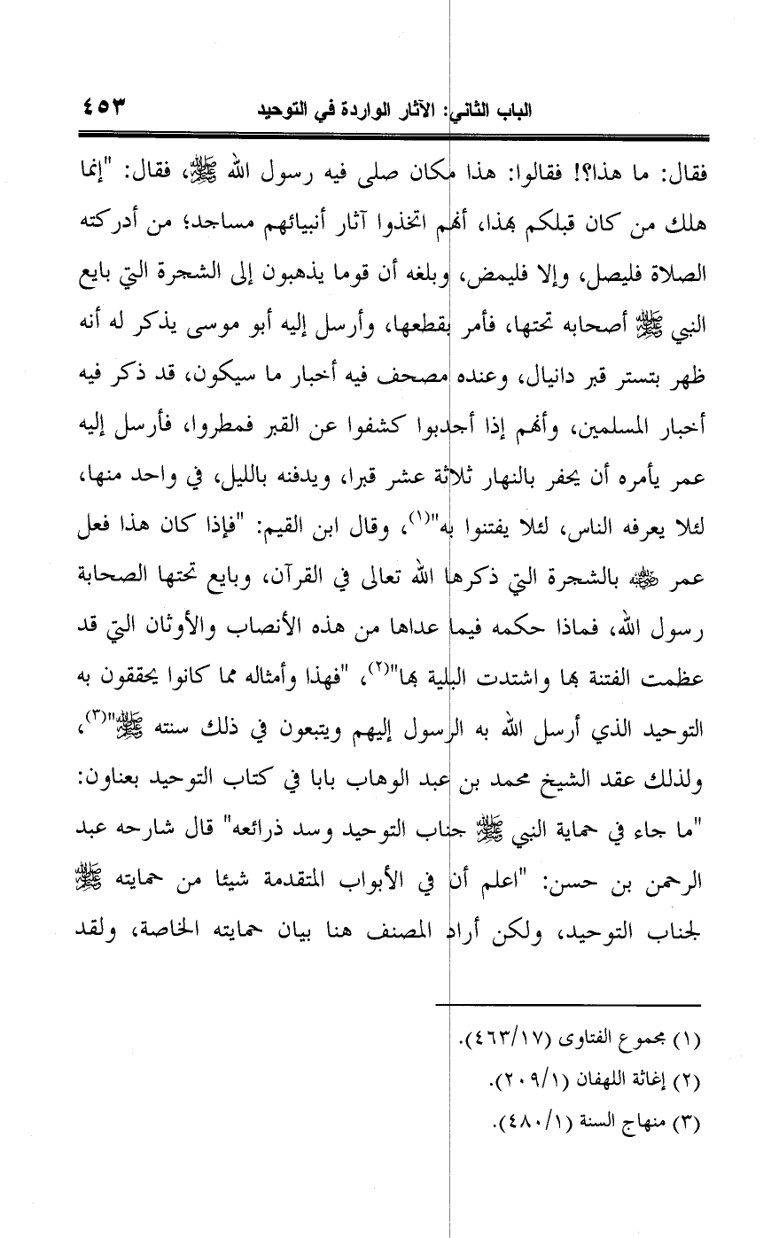 فقال: ما هذا؟ ! فقالوا: هذا مكان صلى فيه رسول اللَّه -صلى اللَّه عليه وسلم-، فقال: "إنما هلك من كان قبلكم بهذا، أنهم اتخذوا آثار أنبيائهم مساجد؛ من أدركته الصلاة فليصل، وإلا فليمض، وبلغه أن قوما يذهبون إلى الشجرة التي بايع النبي -صلى اللَّه عليه وسلم- أصحابه تحتها، فأمر بقطعها، وأرسل إليه أبو موسى يذكر له أنه ظهر بتستر قبر دانيال، وعنده مصحف فيه أخبار ما سيكون، قد ذكر فيه أخبار المسلمين، وأنهم إذا أجدبوا كشفوا عن القبر فمطروا، فأرسل إليه عمر يأمره أن يحفر بالنهار ثلاثة عشر قبرا، ويدفنه بالليل، في واحد منها، لئلا يعرفه الناس، لئلا يفتنوا به" (¬١)، وقال ابن القيم: "فإذا كان هذا فعل عمر -رضي اللَّه عنه- بالشجرة التي ذكرها اللَّه تعالى في القرآن، وبايع تحتها الصحابة رسول اللَّه، فماذا حكمه فيما عداها من هذه الأنصاب والأوثان التي قد عظمت الفتنة بها واشتدت البلية بها" (¬٢)، "فهذا وأمثاله مما كانوا يحققون به التوحيد الذي أرسل اللَّه به الرسول إليهم ويتبعون في ذلك سنته -صلى اللَّه عليه وسلم-" (¬٣)، ولذلك عقد الشيخ محمد بن عبد الوهاب بابا في كتاب التوحيد بعنوان: "ما جاء في حماية النبي -صلى اللَّه عليه وسلم- جناب التوحيد وسد ذرائعه" قال شارحه عبد الرحمن بن حسن: "اعلم أن في الأبواب المتقدمة شيئا من حمايته -صلى اللَّه عليه وسلم- لجناب التوحيد، ولكن أراد المصنف هنا بيان حمايته الخاصة، ولقد