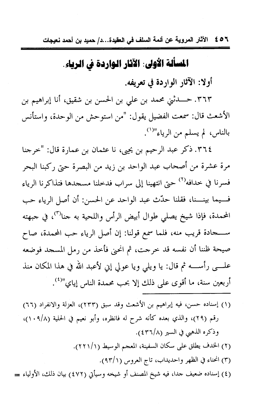 ٣٦٤ - ذكر عبد الرحيم بن يحيى، نا عثمان بن عمارة قال: "خرجنا مرة عشرة من أصحاب عبد الواحد بن زيد من البصرة حتى ركبنا البحر فسرنا في خدافه (¬٢) حتى انتهينا إلى سراب فدخلنا مسجدها فتذاكرنا الرياء فيما بيننا، فقلنا حدّث عبد الواحد عن الحسن: أن أصل الرياء حب المحمدة، فإذا شيخ يصلي طوال أبيض الرأس واللحية به جنا (¬٣)، في جبهته سجادة قريب منه، فلما سمع قولنا: إن أصل الرياء حب المحمدة، صاح صيحة ظننا أن نفسه قد خرجت، ثم انحئ فأخذ من رمل المسجد فوضعه على رأسه ثم قال: يا ويلي ويا عولي إني لأعبد اللَّه في هذا المكان منذ أربعين سنة، ما أقوى على ذلك إلا بحب محمدة الناس إياي" (¬٤).