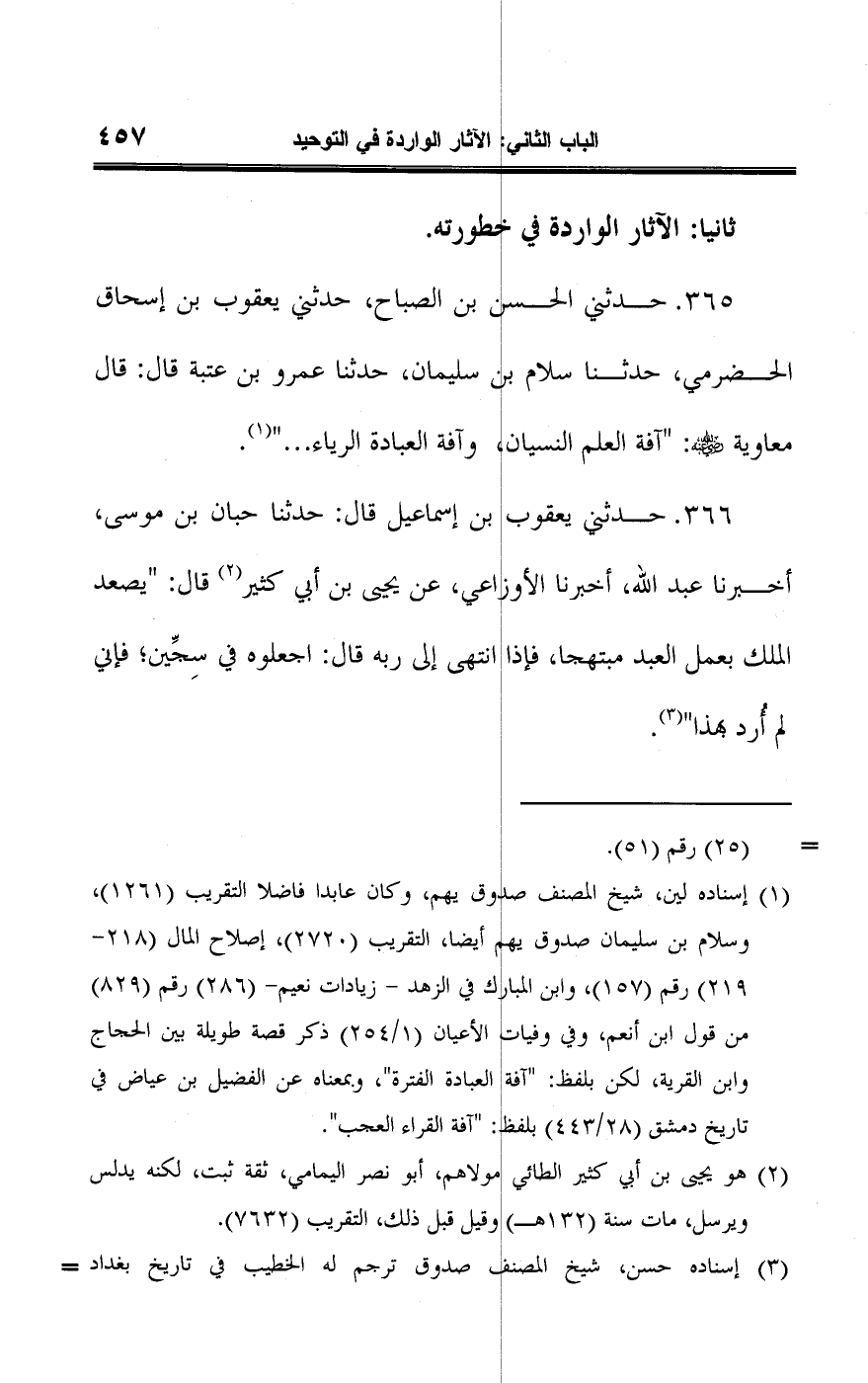 ٣٦٥ - حدثني الحسن بن الصباح، حدثني يعقوب بن إسحاق الحضرمي، حدثنا سلام بن سليمان، حدثنا عمرو بن عتبة قال: قال معاوية -رضي اللَّه عنه-: "آفة العلم النسيان، وآفة العبادة الرياء. . . " (¬١).