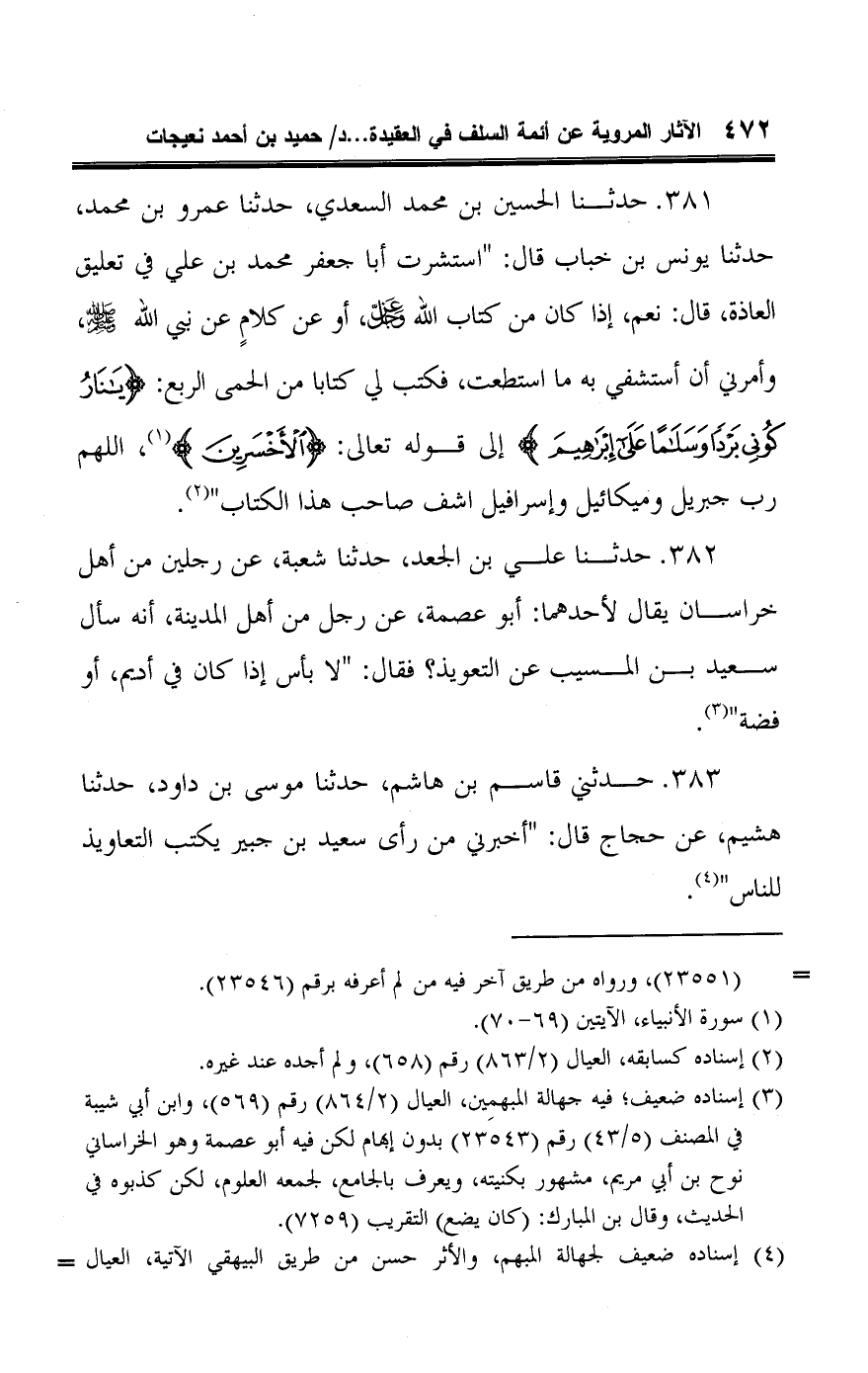 ٣٨١ - حدثنا الحسين بن محمد السعدي، حدثنا عمرو بن محمد، حدثنا يونس بن خباب قال: "استشرت أبا جعفر محمد بن علي في تعليق العاذة، قال: نعم؛ إذا كان من كتاب اللَّه عَزَّ وَجَلَّ، أو عن كلامٍ عن نبي اللَّه -صلى اللَّه عليه وسلم-، وأمرني أن أستشفى به ما استطعت، فكتب لي كتابا من الحمى الربع: {يَانَارُ كُونِي بَرْدًا وَسَلَامًا عَلَى إِبْرَاهِيمَ} إلى قوله تعالى: {الْأَخْسَرِينَ} (¬١)، اللهم رب جبريل وميكائيل وإسرافيل اشف صاحب هذا الكتاب" (¬٢).