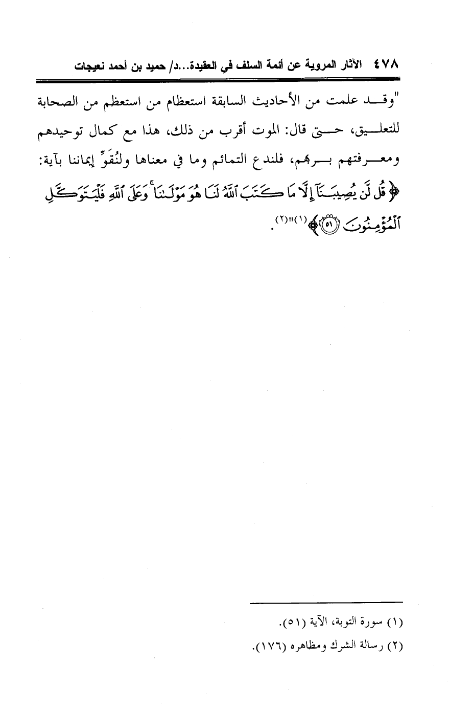 "وقد علمت من الأحاديث السابقة استعظام من استعظم من الصحابة للتعليق، حتى قال: الموت أقرب من ذلك، هذا مع كمال توحيدهم ومعرفتهم بربهم، فلندع التمائم وما في معناها ولنُقَوِّ إيماننا بآية: {قُلْ لَنْ يُصِيبَنَا إِلَّا مَا كَتَبَ اللَّهُ لَنَا هُوَ مَوْلَانَا وَعَلَى اللَّهِ فَلْيَتَوَكَّلِ الْمُؤْمِنُونَ (٥١)} (¬١) " (¬٢).