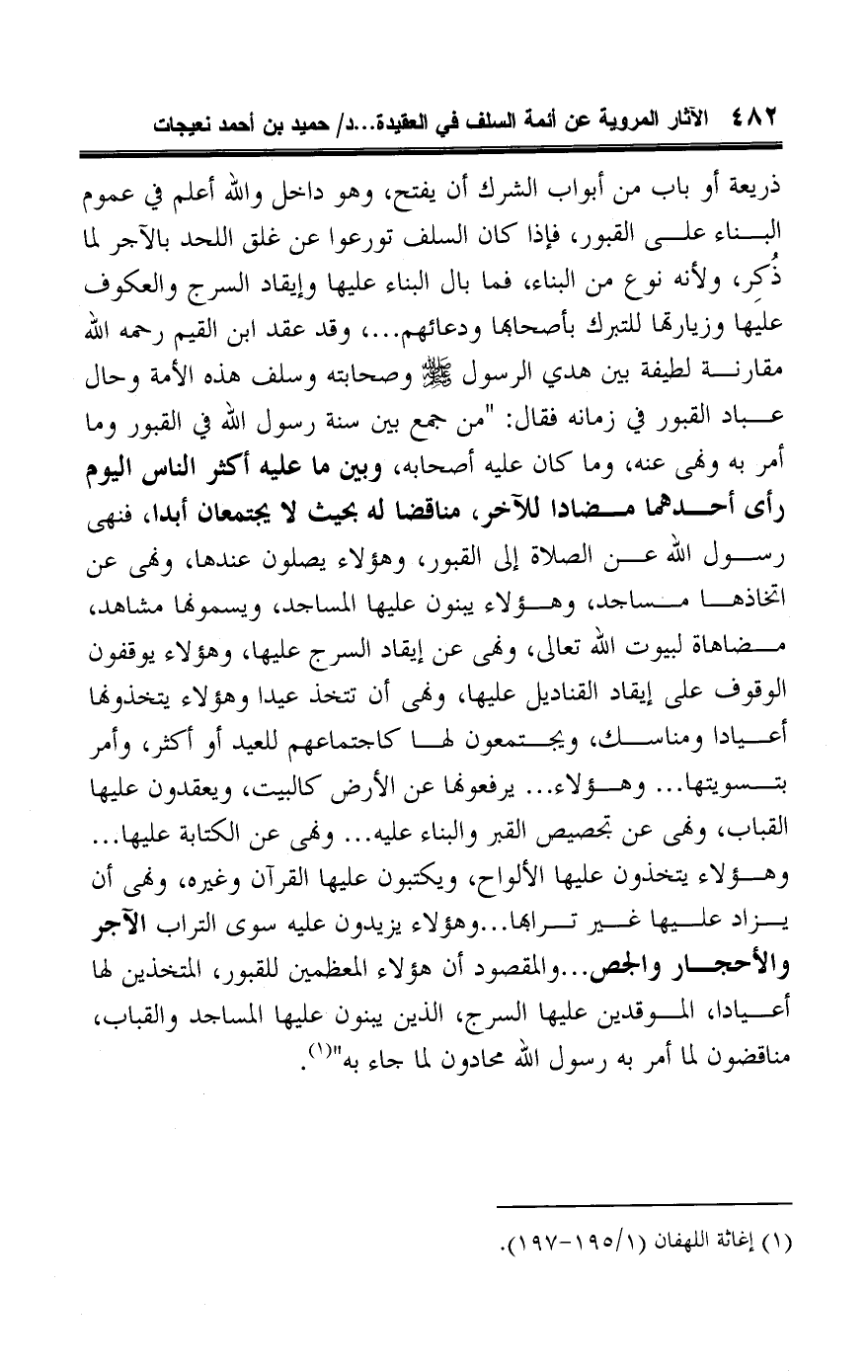 ذريعة أو باب من أبواب الشرك أن يفتح، وهو داخل واللَّه أعلم في عموم البناء على القبور، فإذا كان السلف تورعوا عن غلق اللحد بالآجر لما ذُكِر، ولأنه نوع من البناء، فما بال البناء عليها وإيقاد السرج والعكوف عليها وزيارتها للتبرك بأصحابها ودعائهم. . .، وقد عقد ابن القيم رحمه اللَّه مقارنة لطيفة بين هدي الرسول -صلى اللَّه عليه وسلم- وصحابته وسلف هذه الأمة وحال عباد القبور في زمانه فقال: "من جمع بين سنة رسول اللَّه في القبور وما أمر به ونهي عنه، وما كان عليه أصحابه، وبين ما عليه أكثر الناس اليوم رأى أحدهما مضادا للآخر، مناقضا له بحيث لا يجتمعان أبدا، فنهى رسول اللَّه عن الصلاة إلى القبور، وهؤلاء يصلون عندها، ونهى عن اتخاذها مساجد، وهؤلاء يبنون عليها المساجد، ويسمونها مشاهد، مضاهاة لبيوت اللَّه تعالى، ونهى عن إيقاد السرج عليها، وهؤلاء يوقفون الوقوف على إيقاد القناديل عليها، ونهى أن تتخذ عيدا وهؤلاء يتخذونها أعيادا ومناسك، ويجتمعون لها كاجتماعهم للعيد أو أكثر، وأمر بتسويتها. . . وهؤلاء. . . يرفعونها عن الأرض كالبيت، ويعقدون عليها القباب، ونهى عن تجصيص القبر والبناء عليه. . . ونهى عن الكتابة عليها. . . وهؤلاء يتخذون عليها الألواح، ويكتبون عليها القرآن وغيره، ونهى أن يزاد عليها غير ترابها. . . وهؤلاء يزيدون عليه سوى التراب الآجر والأحجار والجص. . . والمقصود أن هؤلاء المعظمين للقبور، المتخذين لها أعيادا، الموقدين عليها السرج، الذين يبنون عليها المساجد والقباب، مناقضون لما أمر به رسول اللَّه محادون لما جاء به" (¬١).