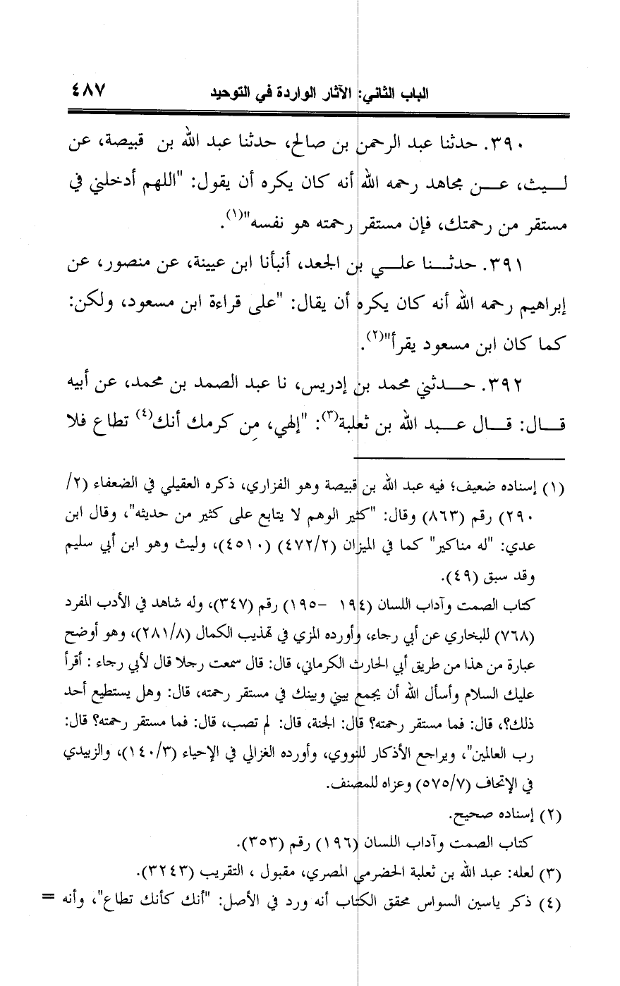 ٣٩٠ - حدثنا عبد الرحمن بن صالح، حدثنا عبد اللَّه بن قبيصة، عن ليث، عن مجاهد رحمه اللَّه أنه كان يكره أن يقول: "اللهم أدخلني في مستقر من رحمتك، فإن مستقر رحمته هو نفسه" (¬١).