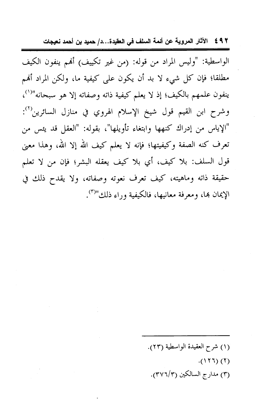 الواسطية: "وليس المراد من قوله: (من غير تكييف) أنهم ينفون الكيف مطلقا؛ فإن كل شيء لا بد أن يكون على كيفية ما، ولكن المراد أنهم ينفون علمهم بالكيف؛ إذ لا يعلم كيفية ذاته وصفاته إلا هو سبحانه" (¬١)، وشرح ابن القيم قول شيخ الإسلام الهروي في منازل السائرين (¬٢): "الإياس من إدراك كنهها وابتغاء تأويلها"، بقوله: "العقل قد يئس من تعرف كنه الصفة وكيفيتها؛ فإنه لا يعلم كيف اللَّه إلا اللَّه، وهذا معنى قول السلف: بلا كيف، أي بلا كيف يعقله البشر؛ فإن من لا تعلم حقيقة ذاته وماهيته، كيف تعرف نعوته وصفاته، ولا يقدح ذلك في الإيمان بها، ومعرفة معانيها، فالكيفية وراء ذلك" (¬٣).