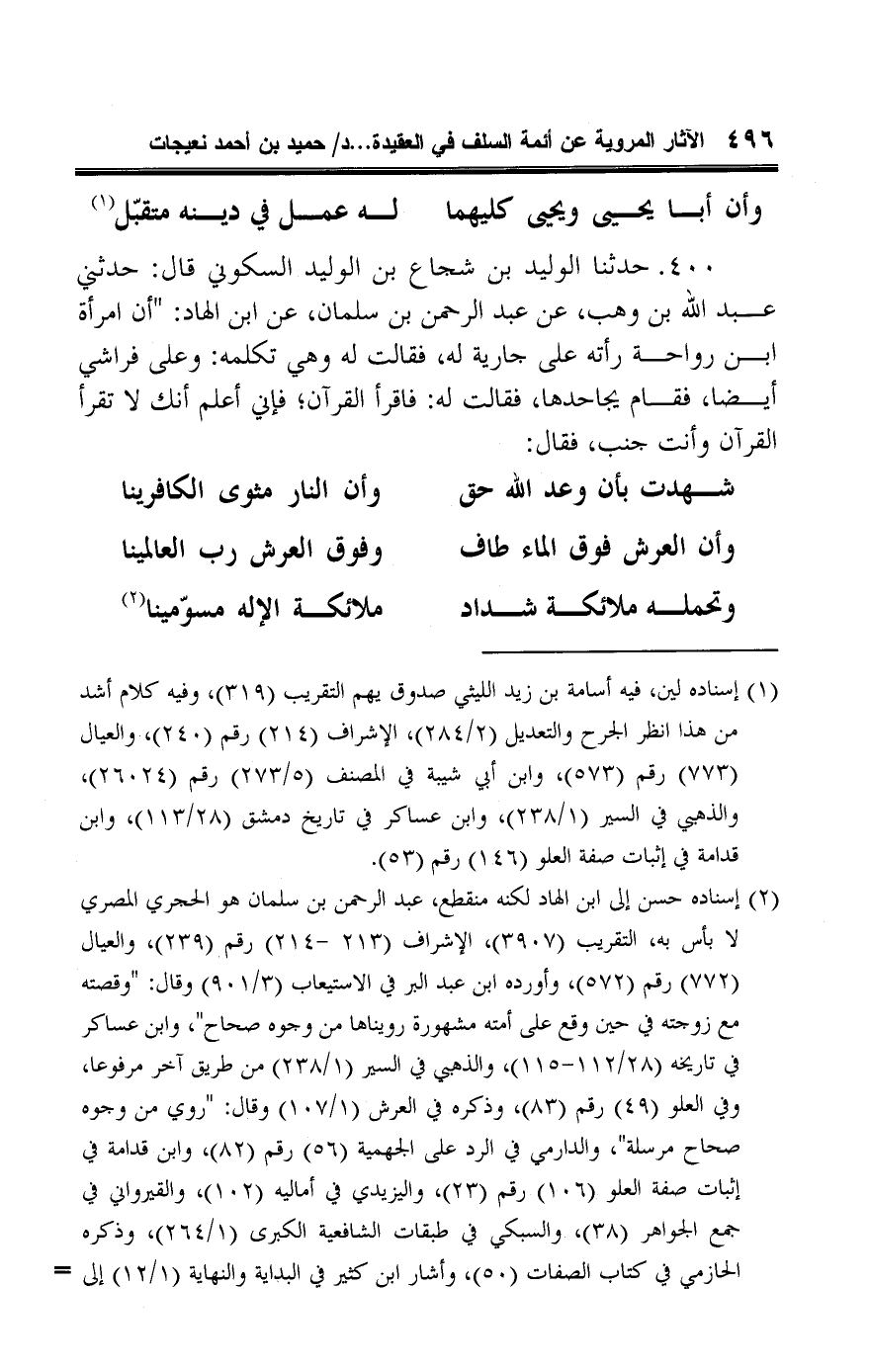 ٤٠٠ - حدثنا الوليد بن شجاع بن الوليد السكوني قال: حدثني عبد اللَّه بن وهب، عن عبد الرحمن بن سلمان، عن ابن الهاد: "أن امرأة ابن رواحة رأته على جارية له، فقالت له وهي تكلمه: وعلى فراشي أيضًا، فقام يجاحدها، فقالت له: فاقرأ القرآن؛ فإني أعلم أنك لا تقرأ القرآن وأنت جنب، فقال: