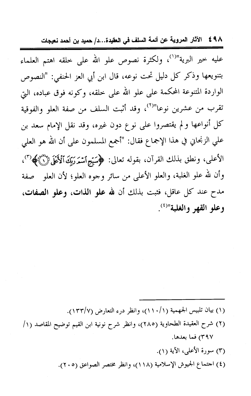عليه خير البرية" (¬١)، ولكثرة نصوص علو اللَّه على خلقه اهتم العلماء بتنويعها وذكر كل دليل تحت نوعه، قال ابن أبي العز الحنفي: "النصوص الواردة المتنوعة المحكمة على علو اللَّه على خلقه، وكونه فوق عباده، التي تقرب من عشرين نوعا" (¬٢)، وقد أثبت السلف من صفة العلو والفوقية كل أنواعها ولم يقتصروا على نوع دون غيره، وقد نقل الإمام سعد بن علي الزنجاني في هذا الإجماع فقال: "أجمع المسلمون على أن اللَّه هو العلي الأعلى، ونطق بذلك القرآن، بقوله تعالى: {سَبِّحِ اسْمَ رَبِّكَ الْأَعْلَى (١)} (¬٣)، وأن للَّه علو الغلبة، والعلو الأعلى من سائر وجوه العلو؛ لأن العلو صفة مدح عند كل عاقل، فثبت بذلك أن للَّه علو الذات، وعلو الصفات، وعلو القهر والغلبة" (¬٤).