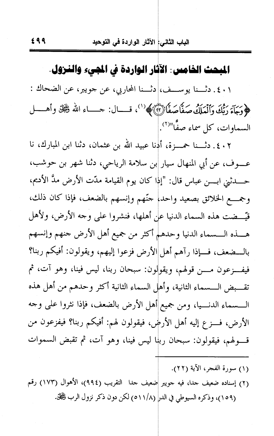 ٤٠١ - دثنا يوسف، دثنا المحاربي، عن جويبر، عن الضحاك: {وَجَاءَ رَبُّكَ وَالْمَلَكُ صَفًّا صَفًّا (٢٢)} (¬١)، قال: جاء اللَّه عَزَّ وَجَلَّ وأهل السماوات، كل سماء صفًّا" (¬٢).