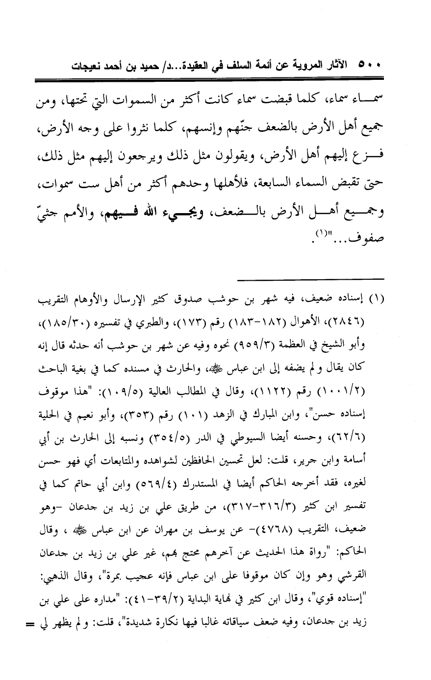 سماء سماء، كلما قبضت سماء كانت أكثر من السماوات التي تحتها، ومن جميع أهل الأرض بالضعف جنّهم وإنسهم، كلما نثروا على وجه الأرض، فزع إليهم أهل الأرض، ويقولون مثل ذلك ويرجعون إليهم مثل ذلك، حتى تقبض السماء السابعة، فلأهلها وحدهم أكثر من أهل ست سموات، وجميع أهل الأرض بالضعف، ويجيء اللَّه فيهم، والأمم جثيّ صفوف. . . " (¬١).