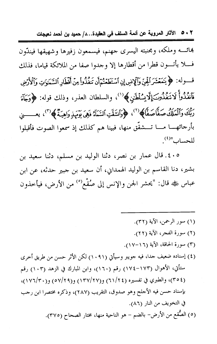 ٤٠٥ - قال عمار بن نصر، دثنا الوليد بن مسلم، دثنا سعيد بن بشمير، دنا القاسم بن الوليد الهمداني، أن سعيد بن جبير حدثه، عن ابن عباس -رضي اللَّه عنه- قال: "يحشر الجن والإنس إلى صُقْع (¬٥) من الأرض، فيأخذون