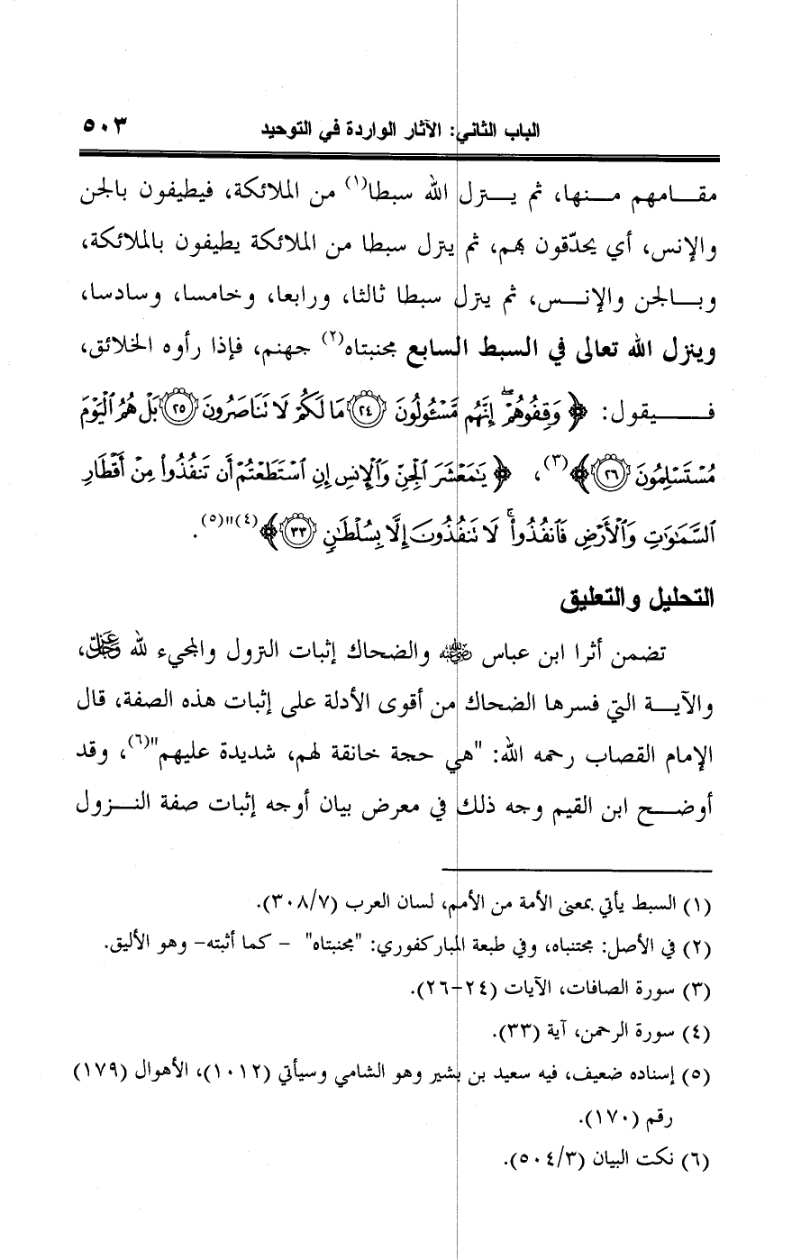 مقامهم منها، ثم ينزل اللَّه سبطا (¬١) من الملائكة، فيطيفون بالجن والإنس، أي يحدّقون بهم، ثم ينزل سبطا من الملائكة يطيفون بالملائكة، وبالجن والإنس، ثم ينزل سبطا ثالثا، ورابعا، وخامسا، وسادسا، وينزل اللَّه تعالى في السبط السابع مجنبتاه (¬٢) جهنم، فإذا رأوه الخلائق، فيقول: {وَقِفُوهُمْ إِنَّهُمْ مَسْئُولُونَ (٢٤) مَا لَكُمْ لَا تَنَاصَرُونَ (٢٥) بَلْ هُمُ الْيَوْمَ مُسْتَسْلِمُونَ (٢٦)} (¬٣)، {يَامَعْشَرَ الْجِنِّ وَالْإِنْسِ إِنِ اسْتَطَعْتُمْ أَنْ تَنْفُذُوا مِنْ أَقْطَارِ السَّمَاوَاتِ وَالْأَرْضِ فَانْفُذُوا لَا تَنْفُذُونَ إِلَّا بِسُلْطَانٍ (٣٣)} (¬٤) " (¬٥).