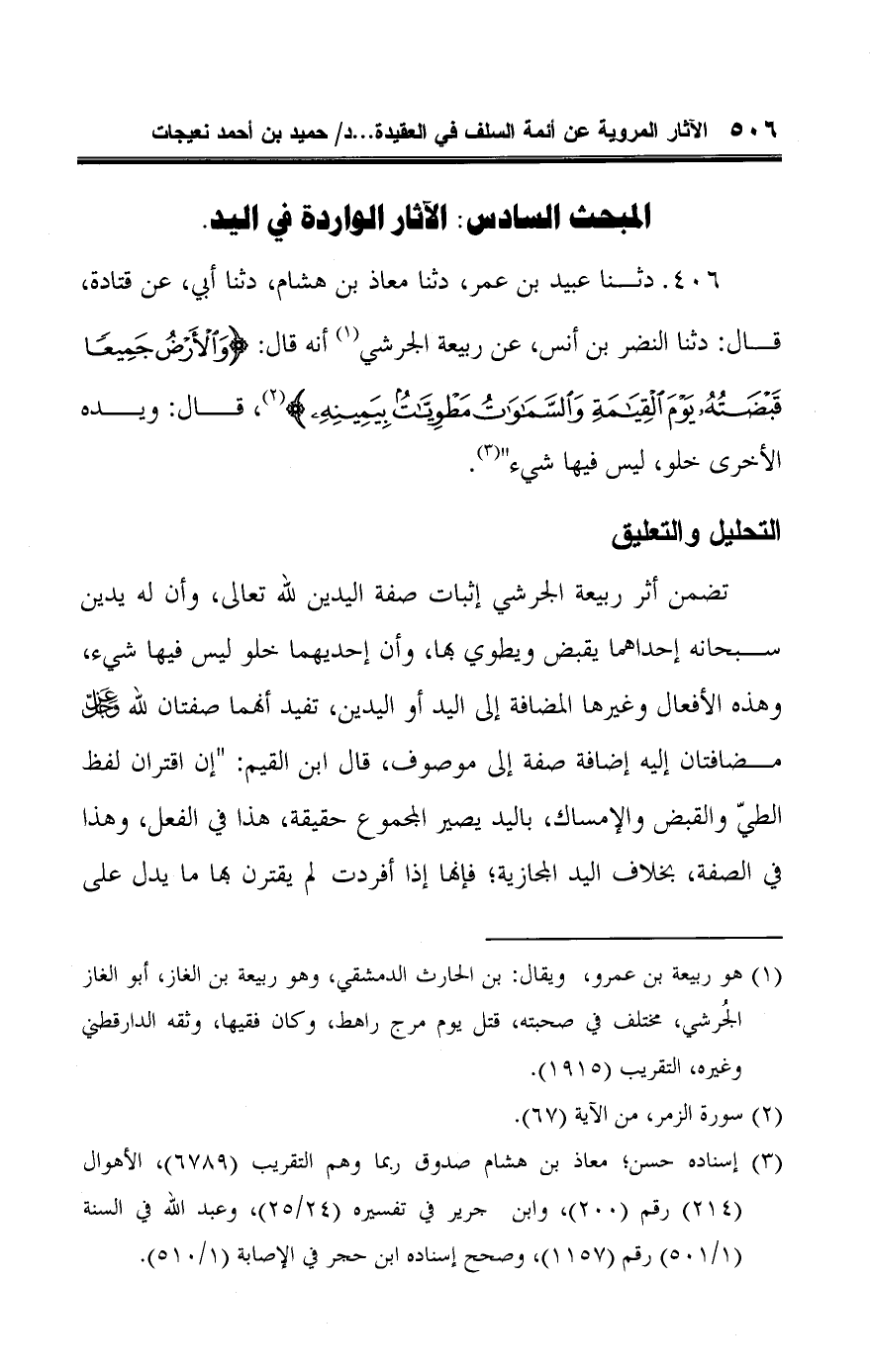 ٤٠٦ - دثنا عبيد بن عمر، دثنا معاذ بن هشام، دثنا أبي، عن قتادة، قال: دثنا النضر بن أنس، عن ربيعة الجرشي (¬١) أنه قال: {وَالْأَرْضُ جَمِيعًا قَبْضَتُهُ يَوْمَ الْقِيَامَةِ وَالسَّمَاوَاتُ مَطْوِيَّاتٌ بِيَمِينِهِ} (¬٢)، قال: ويده الأخرى خلو، ليس فيها شيء" (¬٣).