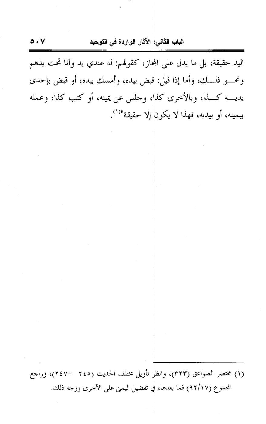 (¬١) مختصر الصواعق (٣٢٣)، وانظر تأويل مختلف الحديث (٢٤٥ - ٢٤٧)، وراجع المجموع (١٧/ ٩٢) فما بعدها، في تفضيل اليمنى على الأخرى ووجه ذلك.