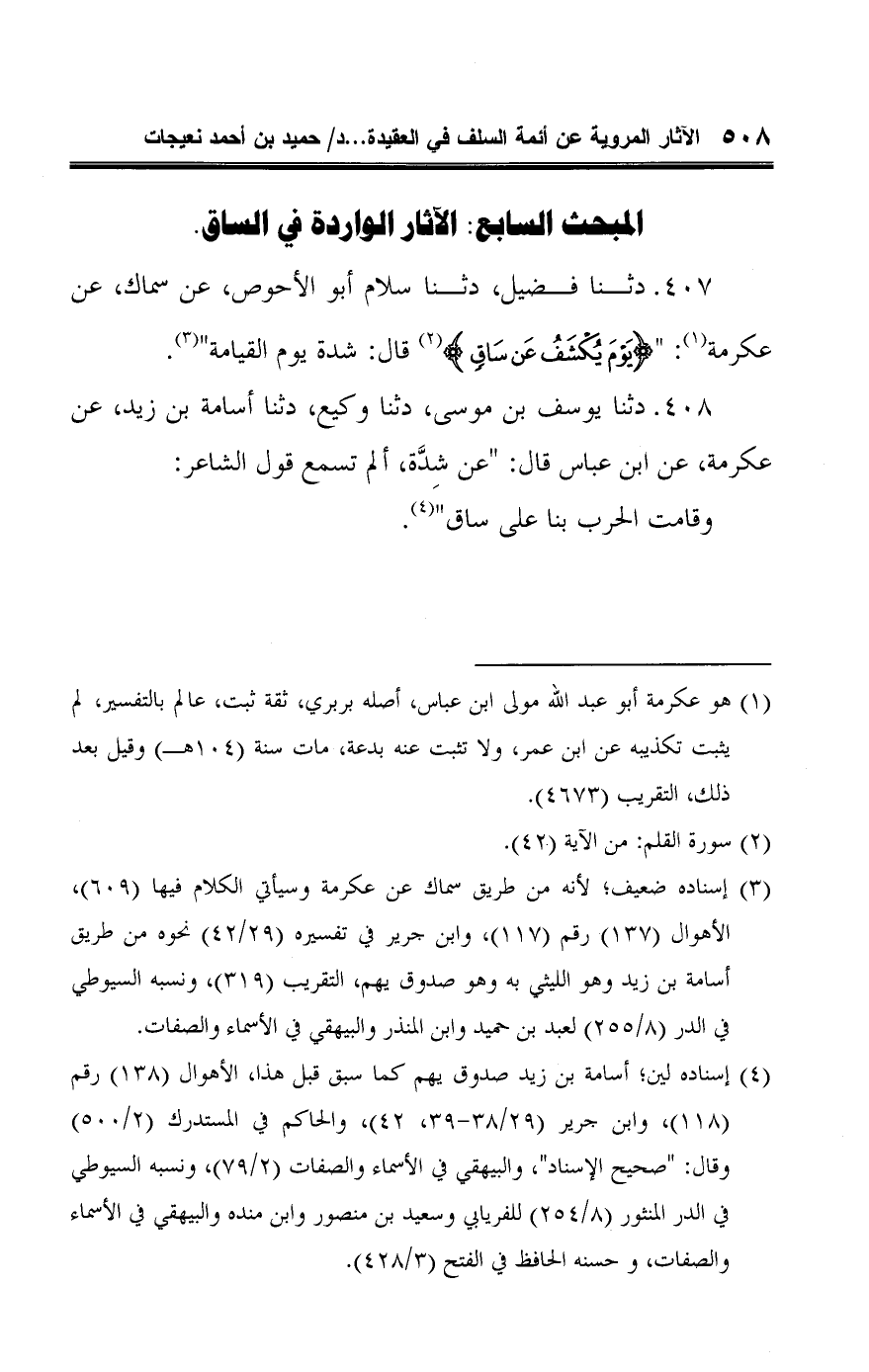 ٤٠٧ - دثنا فضيل، دثنا سلام أبو الأحوص، عن سماك، عن عكرمة (¬١): " {يَوْمَ يُكْشَفُ عَنْ سَاقٍ} (¬٢) قال: شدة يوم القيامة" (¬٣).