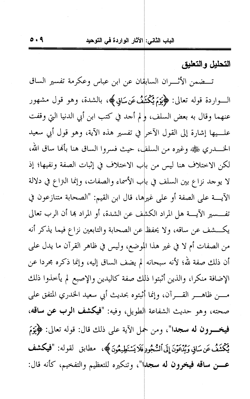 تضمن الأثران السابقان عن ابن عباس وعكرمة تفسير الساق الواردة قوله تعالى: {يَوْمَ يُكْشَفُ عَنْ سَاقٍ}، بالشدة، وهو قول مشهور عنهما وقال به بعض السلف، ولم أجد في كتب ابن أبي الدنيا التي وقفت عليها إشارة إلى القول الآخر في تفسير هذه الآية، وهو قول أبي سعيد الخدري -رضي اللَّه عنه- وغيره من السلف، حيث فسروا الساق هنا بأنها ساق اللَّه، لكن الاختلاف هنا ليس من باب الاختلاف في إثبات الصفة ونفيها؛ إذ لا يوجد نزاع بين السلف في باب الأسماء والصفات، وإنما النزاع في دلالة الآية على الصفة أو على غيرها، قال ابن القيم: "الصحابة متنازعون في تفسير الآية هل المراد الكشف عن الشدة، أو المراد بها أن الرب تعالى يكشف عن ساقه، ولا يحفظ عن الصحابة والتابعين نزاع فيما يذكر أنه من الصفات أم لا في غير هذا الموضع، وليس في ظاهر القرآن ما يدل على أن ذلك صفة للَّه؛ لأنه سبحانه لم يضف الساق إليه، وإنما ذكره مجردا عن الإضافة منكرا، والذين أثبتوا ذلك صفة كاليدين والإصبع لم يأخذوا ذلك من ظاهر القرآن، وإنما أثبتوه بحديث أبي سعيد الخدري المتفق على صحته، وهو حديث الشفاعة الطويل، وفيه: "فيكشف الرب عن ساقه، فيخرون له سجدا"، ومن حمل الآية على ذلك قال: قوله تعالى: {يَوْمَ يُكْشَفُ عَنْ سَاقٍ وَيُدْعَوْنَ إِلَى السُّجُودِ فَلَا يَسْتَطِيعُونَ}، مطابق لقوله: "فيكشف عن ساقه فيخرون له سجدا"، وتنكيره للتعظيم والتفخيم، كأنه قال: