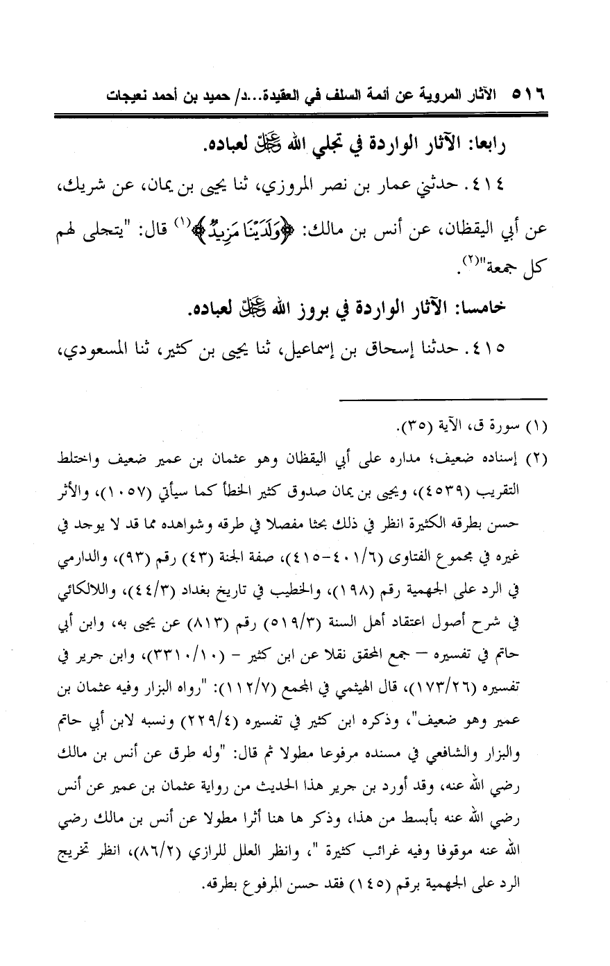 ٤١٤ - حدثني عمار بن نصر المروزي، ثنا يحيى بن يمان، عن شريك، عن أبي اليقظان، عن أنس بن مالك: {وَلَدَيْنَا مَزِيدٌ} (¬١) قال: "يتجلى لهم كل جمعة" (¬٢).