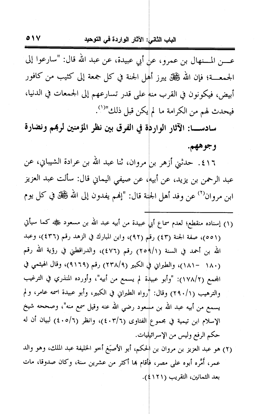 ٤١٦ - حدثني أزهر بن مروان، ثنا عبد اللَّه بن عرادة الشيباني، عن عبد الرحمن بن يزيد، عن أبيه، عن صيفي اليماني قال: سألت عبد العزيز ابن مروان (¬٢) عن وفد أهل الجنة قال: "إنهم يفدون إلى اللَّه -عَزَّ وَجَلَّ- في كل يوم