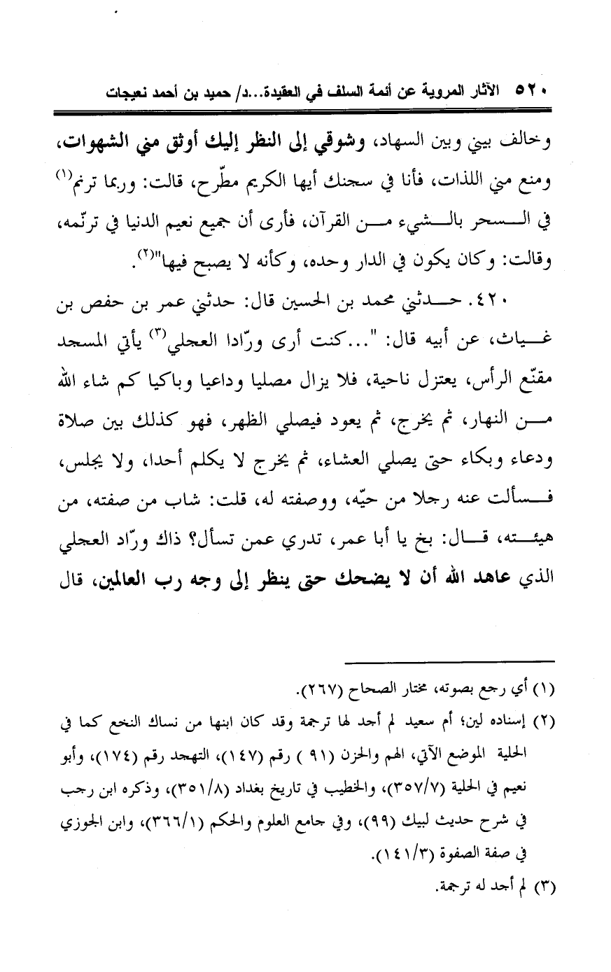 ٤٢٠ - حدثني محمد بن الحسين قال: حدثني عمر بن حفص بن غياث، عن أبيه قال: ". . . كنت أرى ورّادا العجلي (¬٣) يأتي المسجد مقنّع الرأس، يعتزل ناحية، فلا يزال مصليا وداعيا وباكيا كم شاء اللَّه من النهار، ثم يخرج، ثم يعود فيصلي الظهر، فهو كذلك بين صلاة ودعاء وبكاء حتى يصلي العشاء، ثم يخرج لا يكلم أحدا، ولا يجلس، فسألت عنه رجلا من حيّه، ووصفته له، قلت: شاب من صفته، من هيئته، قال: بخ يا أبا عمر، تدري عمن تسأل؟ ذاك ورّاد العجلي الذي عاهد اللَّه أن لا يضحك حتى ينظر إلى وجه رب العالمين، قال