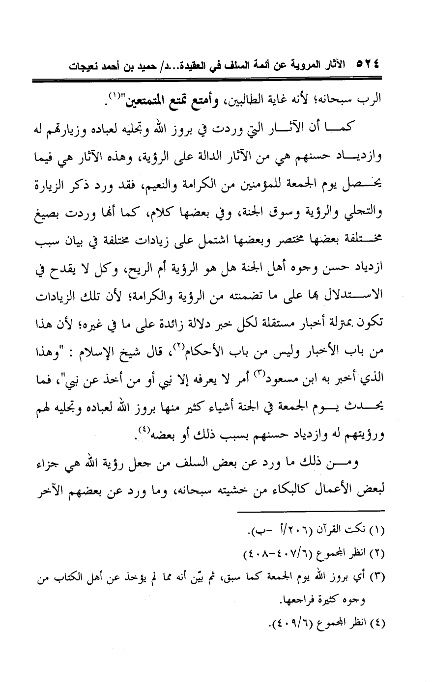 كما أن الآثار التي وردت في بروز اللَّه وتجليه لعباده وزيارتهم له وازدياد حسنهم هي من الآثار الدالة على الرؤية، وهذه الآثار هي فيما يحصل يوم الجمعة للمؤمنين من الكرامة والنعيم، فقد ورد ذكر الزيارة والتجلى والرؤية وسوق الجنة، وفي بعضها كلام، كما أنها وردت بصيغ مختلفة بعضها مختصر وبعضها اشتمل على زيادات مختلفة في بيان سبب ازدياد حسن وجوه أهل الجنة هل هو الرؤية أم الريح، وكل لا يقدح في الاستدلال بها على ما تضمنته من الرؤية والكرامة؛ لأن تلك الزيادات تكون بمنزلة أخبار مستقلة لكل خبر دلالة زائدة على ما في غيره؛ لأن هذا من باب الأخبار وليس من باب الأحكام (¬٢)، قال شيخ الإسلام: "وهذا الذي أخبر به ابن مسعود (¬٣) أمر لا يعرفه إلا نبي أو من أخذ عن نبي"، فما يحدث يوم الجمعة في الجنة أشياء كثير منها بروز اللَّه لعباده وتجليه لهم ورؤيتهم له وازدياد حسنهم بسبب ذلك أو بعضه (¬٤).