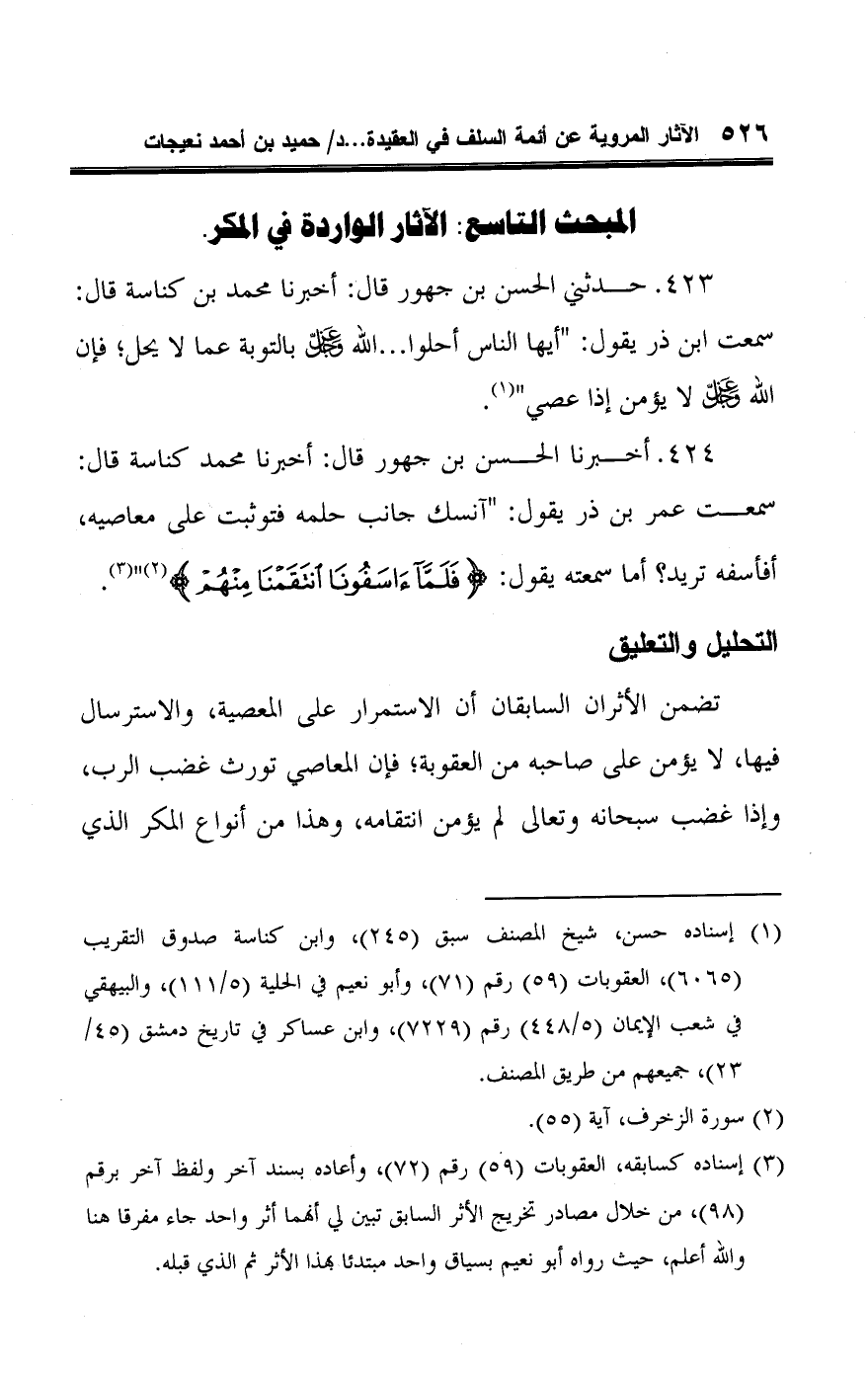 ٤٢٤ - أخبرنا الحسن بن جهور قال: أخبرنا محمد كناسة قال: سمعت عمر بن ذر يقول: "آنسك جانب حلمه فتوثبت على معاصيه، أفأسفه تريد؟ أما سمعته يقول: {فَلَمَّا آسَفُونَا انْتَقَمْنَا مِنْهُمْ} (¬٢) " (¬٣).