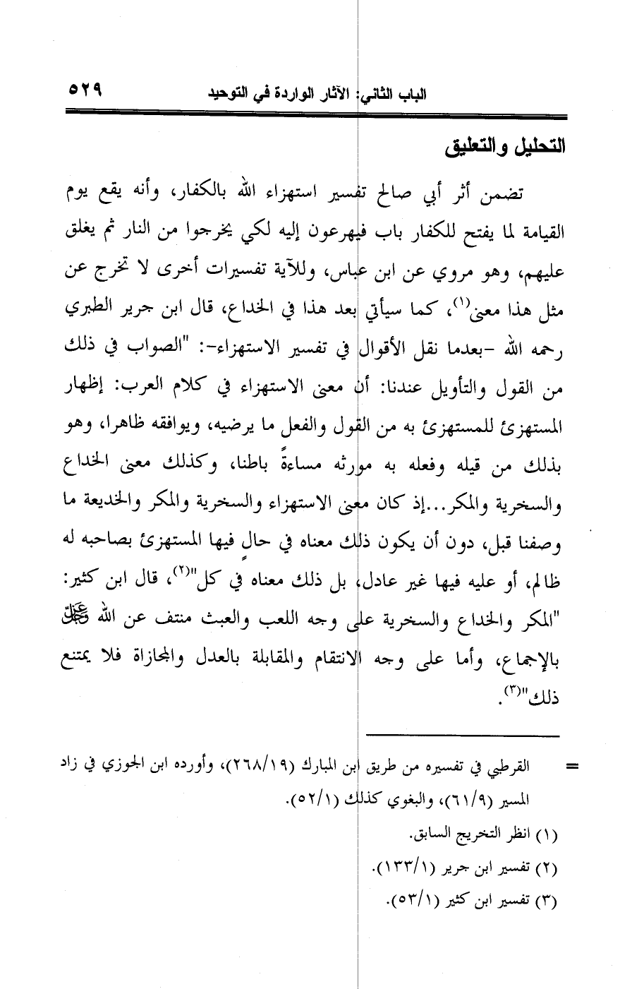 تضمن أثر أبي صالح تفسير استهزاء اللَّه بالكفار، وأنه يقع يوم القيامة لما يفتح للكفار باب فيهرعون إليه لكي يخرجوا من النار ثم يغلق عليهم، وهو مروي عن ابن عباس، وللآية تفسيرات أخرى لا تخرج عن مثل هذا معنى (¬١)، كما سيأتي بعد هذا في الخداع، قال ابن جرير الطبري -رحمه اللَّه- بعدما نقل الأقوال في تفسير الاستهزاء: "الصواب في ذلك من القول والتأويل عندنا: أن معنى الاستهزاء في كلام العرب: إظهار المستهزئ للمستهزئ به من القول والفعل ما يرضيه، ويوافقه ظاهرا، وهو بذلك من قبله وفعله به مورثه مساءةً باطنا، وكذلك معنى الخداع والسخرية والمكر. . . إذ كان معنى الاستهزاء والسخرية والمكر والخديعة ما وصفنا قبل، دون أن يكون ذلك معناه في حالٍ فيها المستهزئ بصاحبه له ظالم، أو عليه فيها غير عادل، بل ذلك معناه في كل" (¬٢)، قال ابن كثير: "المكر والخداع والسخرية على وجه اللعب والعبث منتف عن اللَّه -عَزَّ وَجَلَّ- بالإجماع، وأما على وجه الانتقام والمقابلة بالعدل والمجازاة فلا يمتنع ذلك" (¬٣).