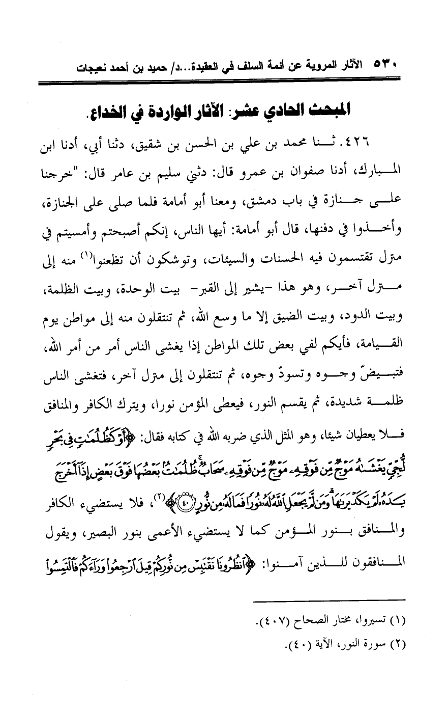 ٤٢٦ - ثنا محمد بن علي بن الحسن بن شقيق، دثنا أبي، أدنا ابن المبارك، أدنا صفوان بن عمرو قال: دثني سليم بن عامر قال: "خرجنا على جنازة في باب دمشق، ومعنا أبو أمامة فلما صلى على الجنازة، وأخذوا في دفنها، قال أبو أمامة: أيها الناس، إنكم أصبحتم وأمسيتم في منزل تقتسمون فيه الحسنات والسيئات، وتوشكون أن تظعنوا (¬١) منه إلى منزل آخر، وهو هذا يشير إلى القبر - بيت الوحدة، وبيت الظلمة، وبيت الدود، وبيت الضيق إلا ما وسع اللَّه، ثم تنتقلون منه إلى مواطن يوم القيامة، فأيكم لفي بعض تلك المواطن إذا يغشى الناس أمر من أمر اللَّه، فتبيضّ وجوه وتسودّ وجوه، ثم تنتقلون إلى منزل آخر، فتغشى الناس ظلمة شديدة، ثم يقسم النور، فيعطى المؤمن نورا، ويترك الكافر والمنافق فلا يعطيان شيئًا، وهو المثل الذي ضربه اللَّه في كتابه فقال: {أَوْ كَظُلُمَاتٍ فِي بَحْرٍ لُجِّيٍّ يَغْشَاهُ مَوْجٌ مِنْ فَوْقِهِ مَوْجٌ مِنْ فَوْقِهِ سَحَابٌ ظُلُمَاتٌ بَعْضُهَا فَوْقَ بَعْضٍ إِذَا أَخْرَجَ يَدَهُ لَمْ يَكَدْ يَرَاهَا وَمَنْ لَمْ يَجْعَلِ اللَّهُ لَهُ نُورًا فَمَا لَهُ مِنْ نُورٍ (٤٠)} (¬٢)، فلا يستضيء الكافر والمنافق بنور المؤمن كما لا يستضيء الأعمى بنور البصير، ويقول المنافقون للذين آمنوا: {انْظُرُونَا نَقْتَبِسْ مِنْ نُورِكُمْ قِيلَ ارْجِعُوا وَرَاءَكُمْ فَالْتَمِسُوا
