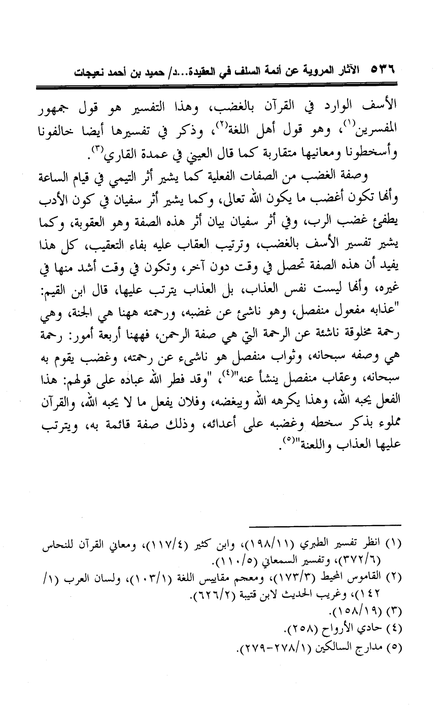 الأسف الوارد في القرآن بالغضب، وهذا التفسير هو قول جمهور المفسرين (¬١)، وهو قول أهل اللغة (¬٢)، وذكر في تفسيرها أيضًا خالفونا وأسخطونا ومعانيها متقاربة كما قال العيني في عمدة القاري (¬٣).