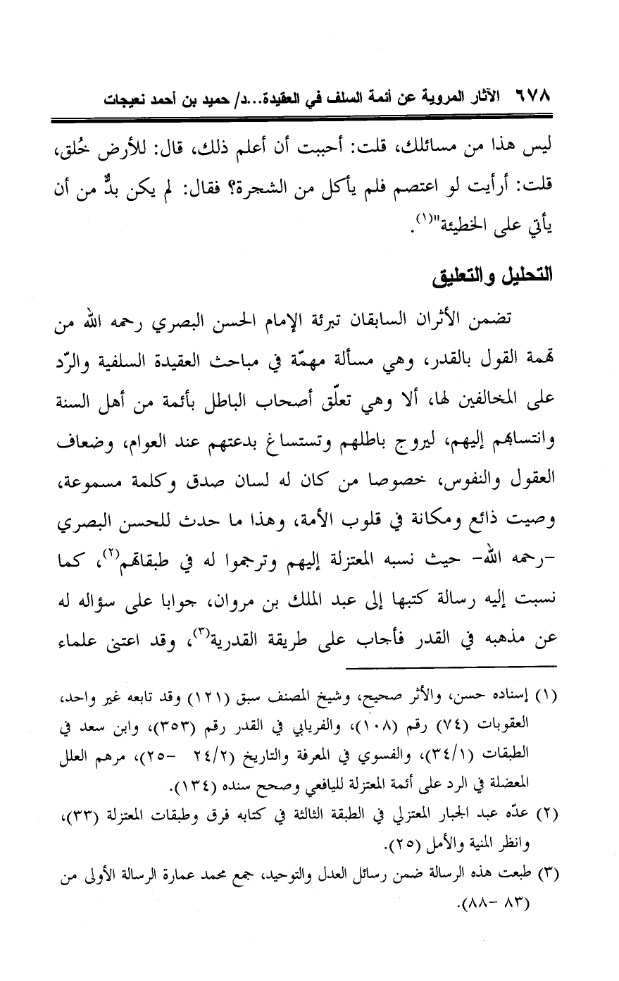 تضمن الأثران السابقان تبرئة الإمام الحسن البصري رحمه اللَّه من تهمة القول بالقدر، وهي مسألة مهمّة في مباحث العقيدة السلفية والرّد على المخالفين لها، ألا وهي تعلّق أصحاب الباطل بأئمة من أهل السنة وانتسابهم إليهم، ليروج باطلهم وتستساغ بدعتهم عند العوام، وضعاف العقول والنفوس، خصوصا من كان له لسان صدق وكلمة مسموعة، وصيت ذائع ومكانة في قلوب الأمة، وهذا ما حدث للحسن البصري -رحمه اللَّه- حيث نسبه المعتزلة إليهم وترجموا له في طبقاتهم (¬٢)، كما نسبت إليه رسالة كتبها إلى عبد الملك بن مروان، جوابا على سؤاله له عن مذهبه في القدر فأجاب على طريقة القدرية (¬٣)، وقد اعتنى علماء