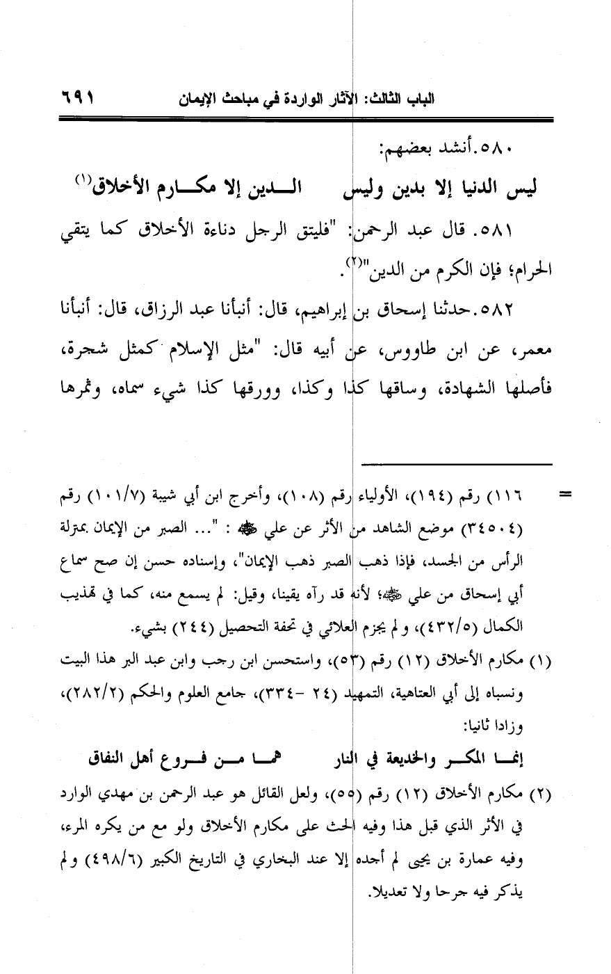 (¬١) مكارم الأخلاق (١٢) رقم (٥٣)، واستحسن ابن رجب وابن عبد البر هذا البيت ونسباه إلى أبي العتاهية، التمهيد (٢٤ - ٣٣٤)، جامع العلوم والحكم (٢/ ٢٨٢)، وزادا ثانيا:
