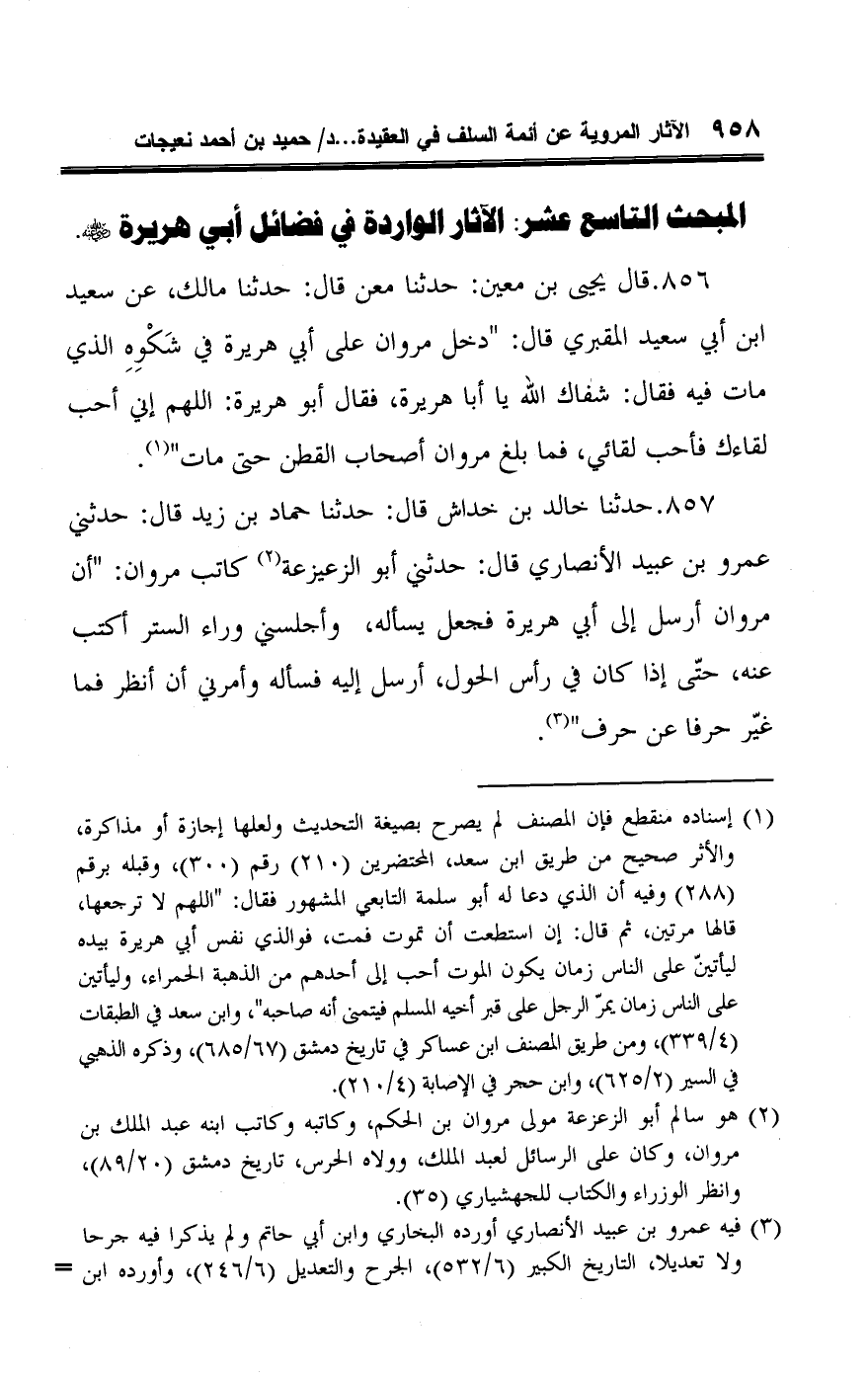 ٨٥٧ - حدثنا خالد بن خداش قال: حدثنا حماد بن زيد قال: حدثني عمرو بن عبيد الأنصاري قال: حدثني أبو الزعيزعة (¬٢) كاتب مروان: "أن مروان أرسل إلى أبي هريرة فجعل يسأله، وأجلسني وراء الستر أكتب عنه، حتّى إذا كان في رأس الحول، أرسل إليه فسأله وأمرني أن انظر فما غيّر حرفا عن حرف" (¬٣).
