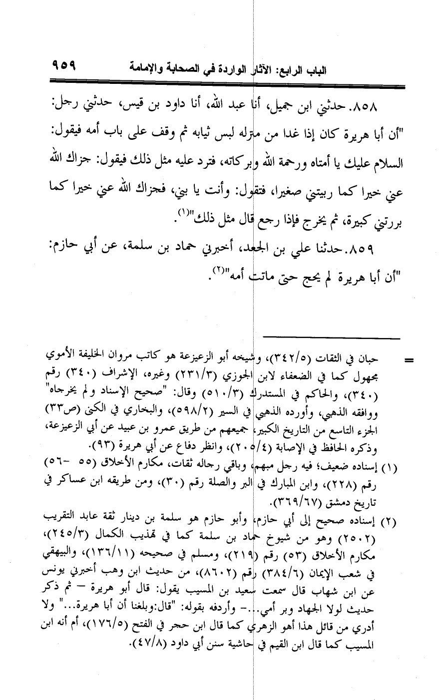٨٥٨ - حدثني ابن جميل، أنا عبد اللَّه، أنا داود بن قيس، حدثني رجل: "أن أبا هريرة كان إذا غدا من منزله لبس ثيابه ثم وقف على باب أمه فيقول: السلام عليك يا أمتاه ورحمة اللَّه وبركاته، فترد عليه مثل ذلك فيقول: جزاك اللَّه عني خيرا كما ربيتي صغيرا، فتقول: وأنت يا بني، فجزاك اللَّه عني خيرا كما بررتني كبيرة، ثم يخرج فإذا رجع قال مثل ذلك" (¬١).