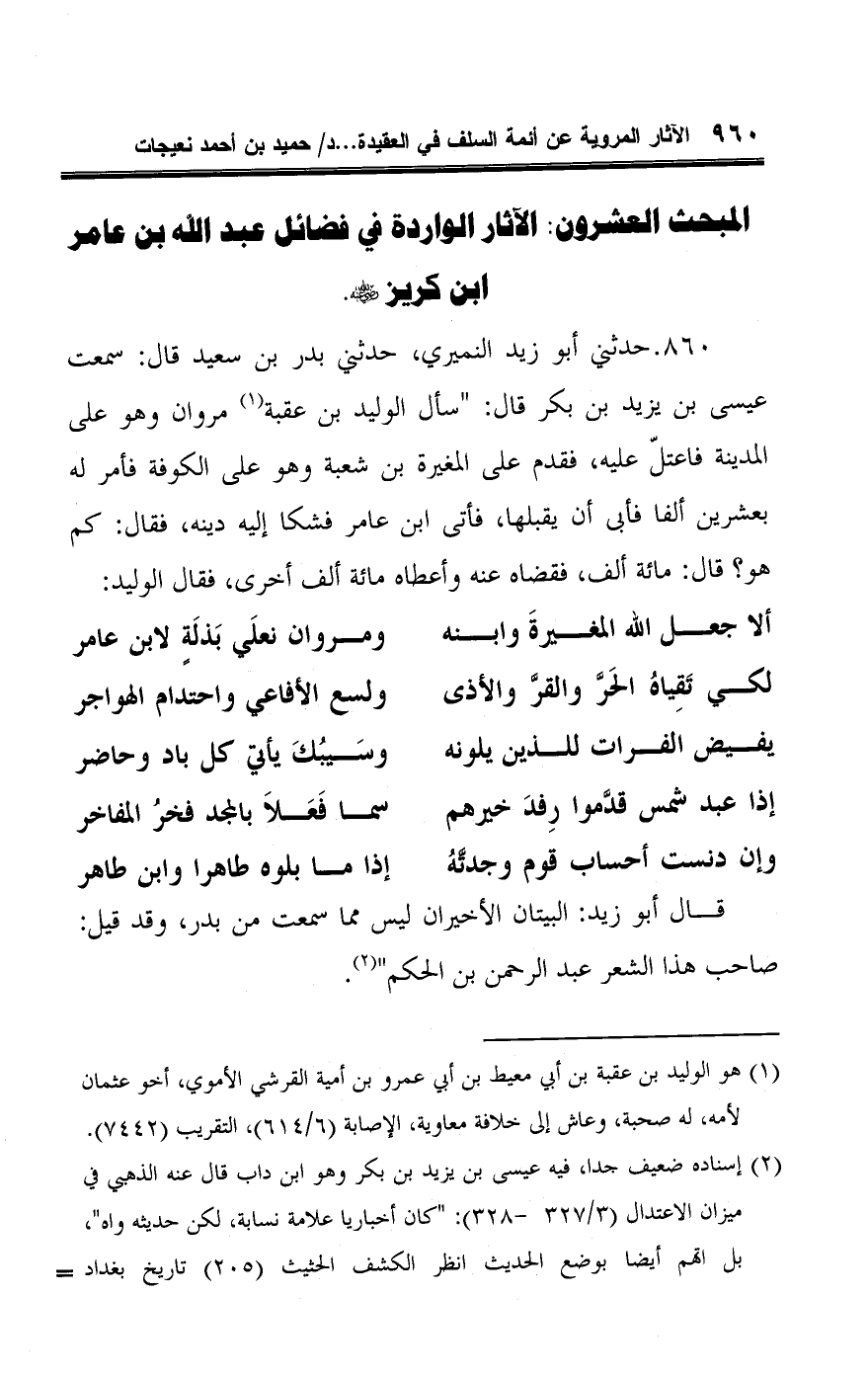 المبحث العشرون: الآثار الواردة في فضائل عبد اللَّه بن عامر ابن كريز -رضي اللَّه عنه-.