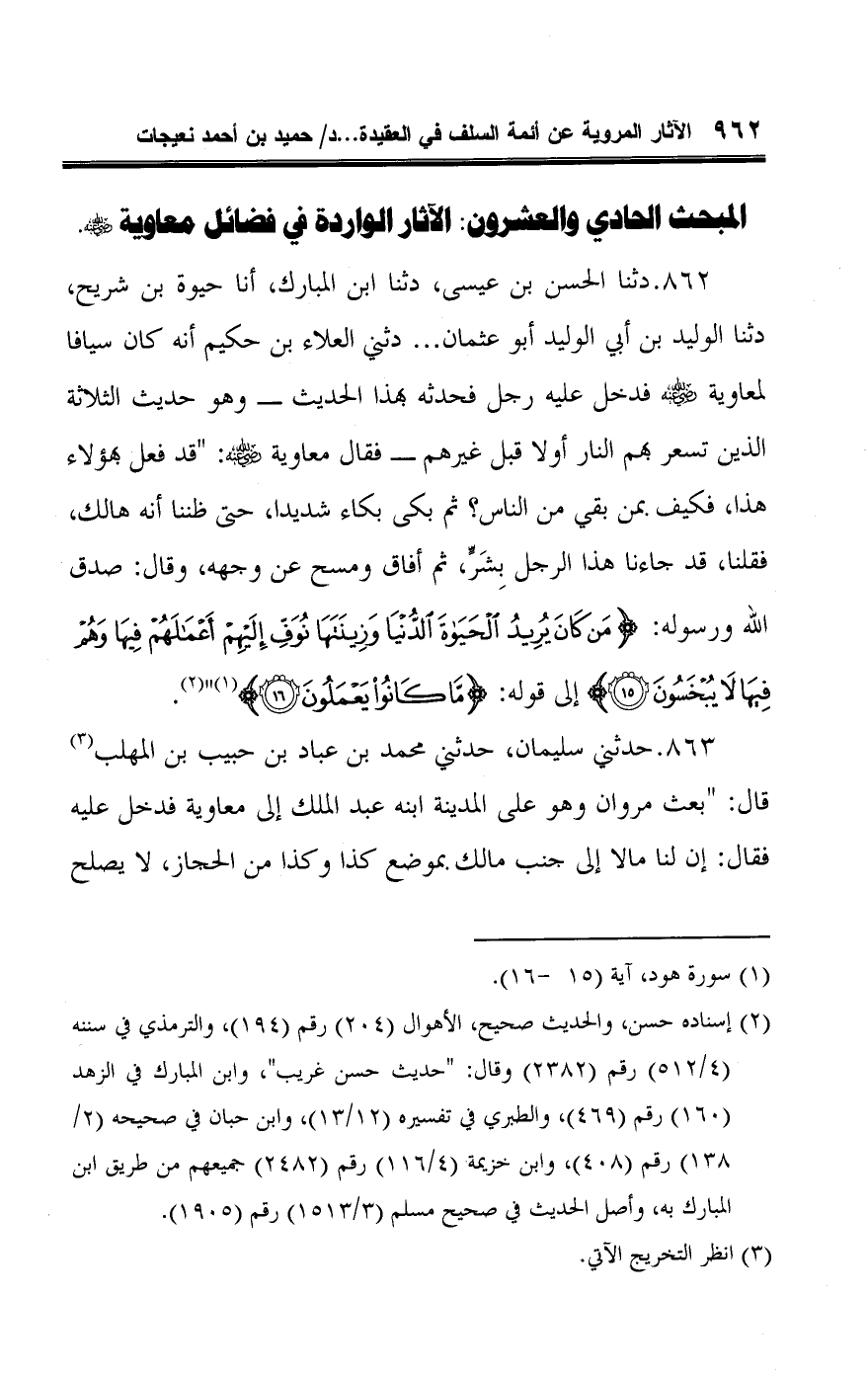 ٨٦٢ - دثنا الحسن بن عيسى، دثنا ابن المبارك، أنا حيوة بن شريح، دثنا الوليد بن أبي الوليد أبو عثمان. . . دثني العلاء بن حكيم أنه كان سيافا لمعاوية -رضي اللَّه عنه- فدخل عليه رجل فحدثه بهذا الحديث -وهو حديث الثلاثة الذين تسعر بهم النار أولا قبل غيرهم- فقال معاوية -رضي اللَّه عنه-: "قد فعل بهؤلاء هذا، فكيف بمن بقي من الناس؟ ثم بكى بكاء شديدا، حتى ظننا أنه هالك، فقلنا، قد جاءنا هذا الرجل بِشَرٍّ، ثم أفاق ومسح عن وجهه، وقال: صدق اللَّه ورسوله: {مَنْ كَانَ يُرِيدُ الْحَيَاةَ الدُّنْيَا وَزِينَتَهَا نُوَفِّ إِلَيْهِمْ أَعْمَالَهُمْ فِيهَا وَهُمْ فِيهَا لَا يُبْخَسُونَ (١٥)} إلى قوله: {مَا كَانُوا يَعْمَلُونَ (١٦)} (¬١) " (¬٢).