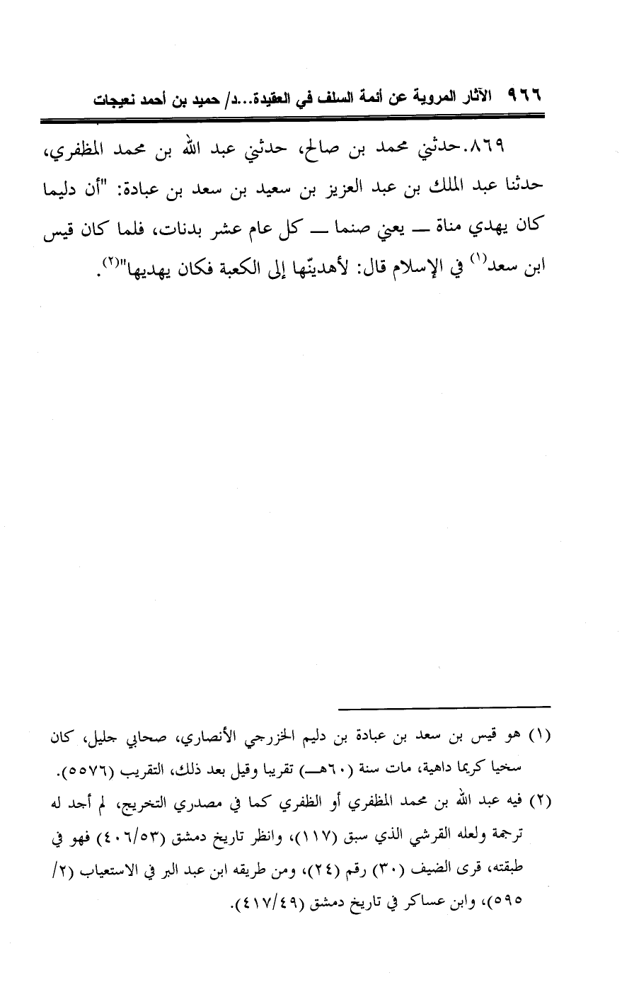 ٨٦٩ - حدثني محمد بن صالح، حدثني عبد اللَّه بن محمد المظفري، حدثنا عبد الملك بن عبد العزيز بن سعيد بن سعد بن عبادة: "أن دليما كان يهدي مناة -يعني صنما- كل عام عشر بدنات، فلما كان قيس ابن سعد (¬١) في الإسلام قال: لأهدينّها إلى الكعبة فكان يهديها" (¬٢).