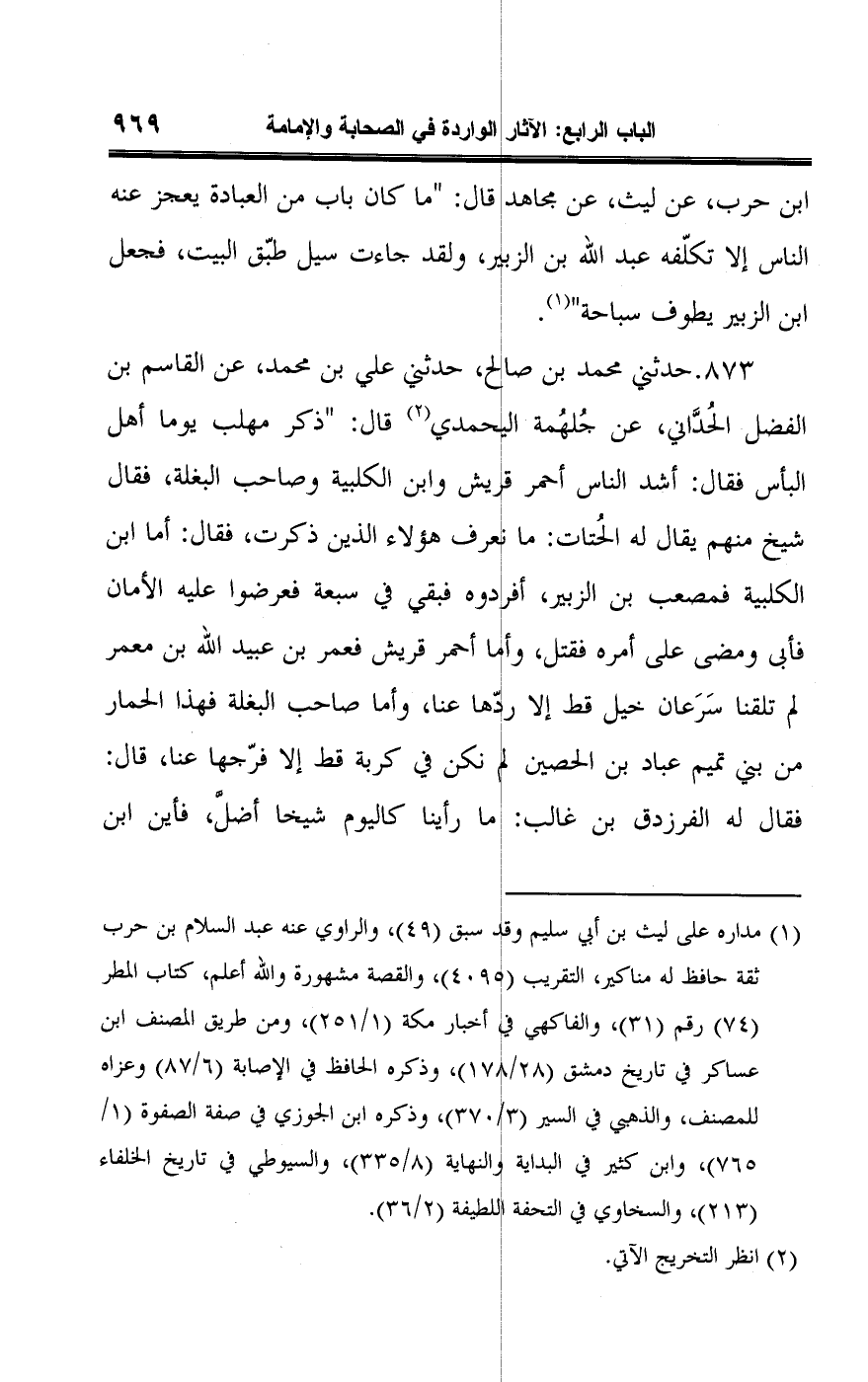 ابن حرب، عن ليث، عن مجاهد قال: "ما كان باب من العبادة يعجز عنه الناس إلا تكلّفه عبد اللَّه بن الزبير، ولقد جاءت سيل طبّق البيت، فجعل ابن الزبير يطوف سباحة" (¬١).