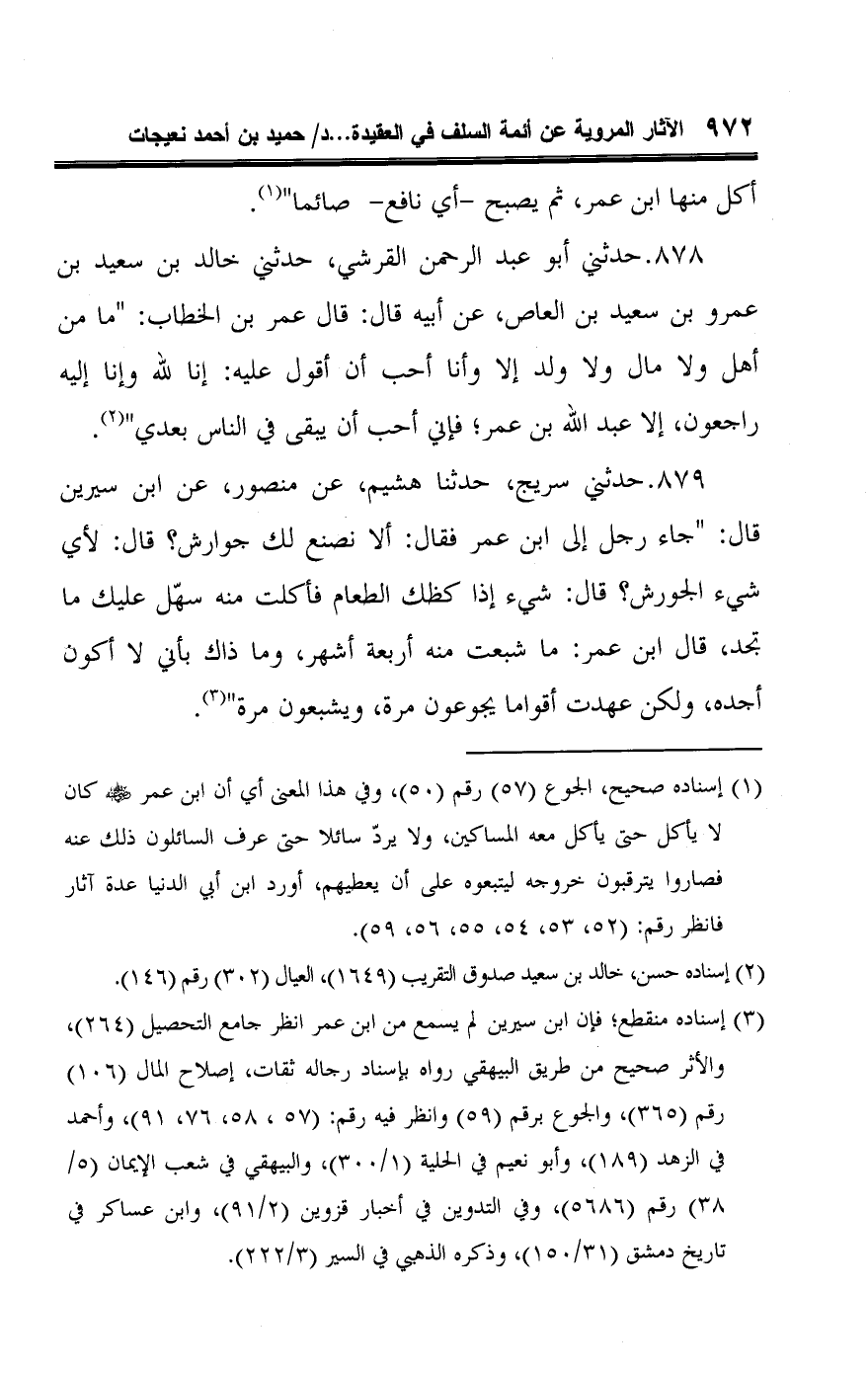 (¬١) إسناده صحيح، الجوع (٥٧) رقم (٥٠)، وفي هذا المعنى أي أن ابن عمر -رضي اللَّه عنه- كان لا يأكل حتى يأكل معه المساكين، ولا يردّ سائلا حتى عرف السائلون ذلك عنه فصاروا يترقبون خروجه ليتبعوه على أن يعطيهم، أورد ابن أبي الدنيا عدة آثار فانظر رقم: (٥٢، ٥٣، ٥٤، ٥٥، ٥٦، ٥٩).