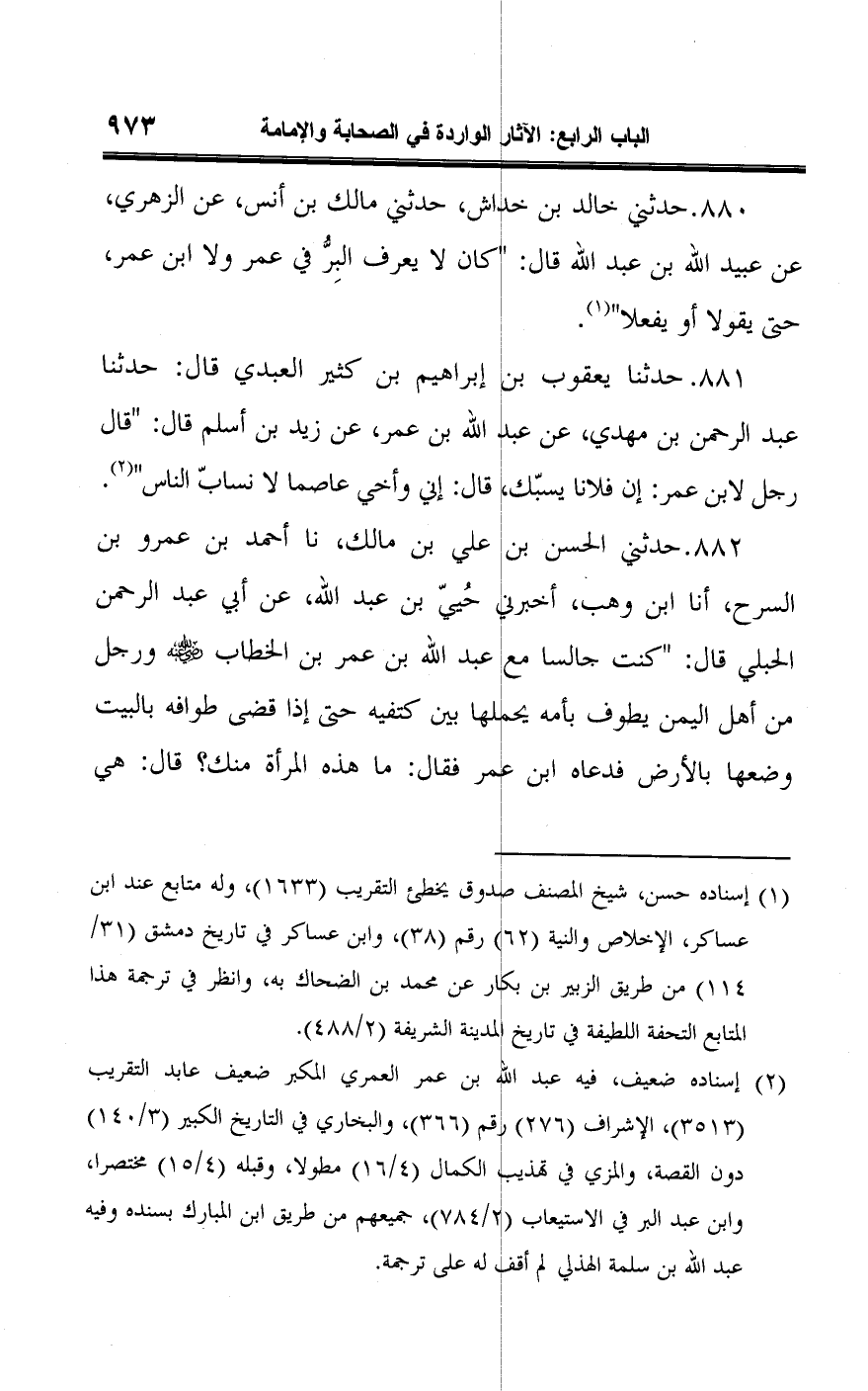 ٨٨١ - حدثنا يعقوب بن إبراهيم بن كثير العبدي قال: حدثنا عبد الرحمن بن مهدي، عن عبدا اللَّه بن عمر، عن زيد بن أسلم قال: "قال رجل لابن عمر: إن فلانا يسبّك، قال: إني وأخي عاصما لا نسابّ الناس" (¬٢).